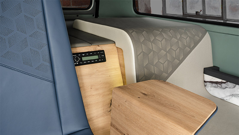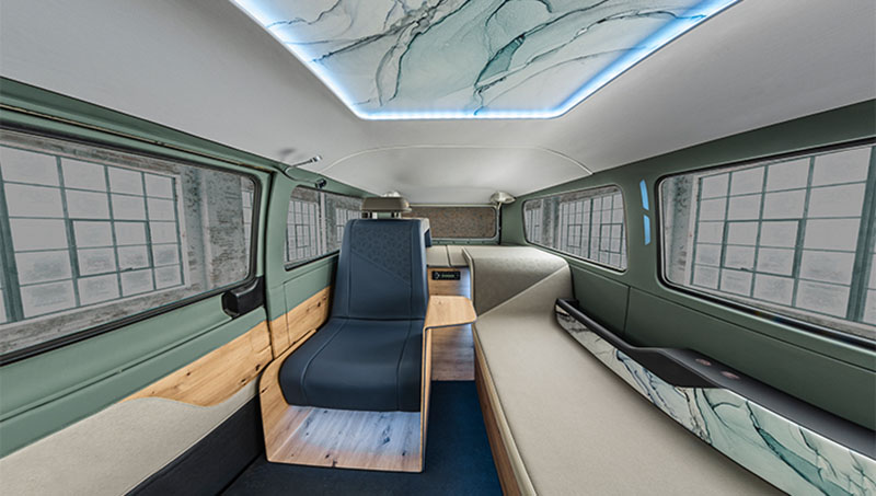 基本上AMBIENC3除了車體外觀與結構仍沿用VW T2外,車內陳設完全經過重新設計裝潢;汽車往往是人們除了住家與工作場所以外,最常待的第三空間,AMBIENC3就是以此概念作延伸,並且融入未來數位化、互聯網與可循環等理念,完全採用先進可循環回收再生材質,並以自然、明亮、溫暖的配色與燈光。打造出有如起居室般的車內空間。