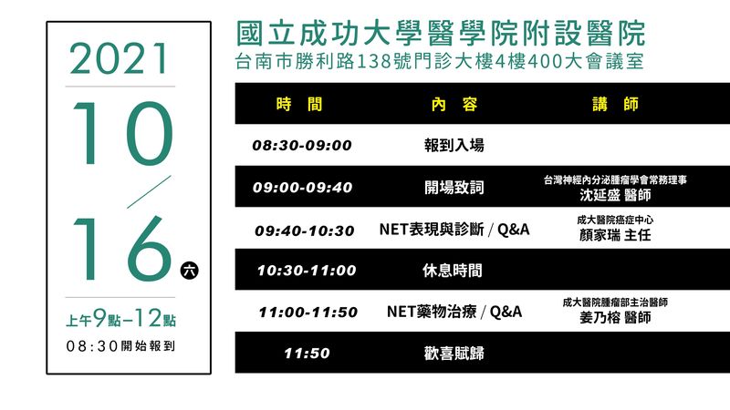 ● 主辦單位:台灣神經內分泌腫瘤學會 病友服務委員會、成大醫院 癌症中心
