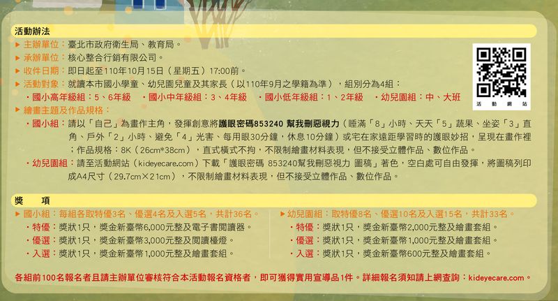 為鼓勵孩子踴躍報名參加,國小組及幼兒園組前100名完成報名者,可獲得實用宣導品1份,活動將邀請公共衛生、視力保健及藝術美術領域學者進行評審,總獎額計69名,此次活動總獎金高達新臺幣14萬元,活動評審結果預定於110年11月3日(星期三)公告,得獎作品有機會刊登於活動網站及展覽中,歡迎臺北市國小學童、幼兒園家長及小朋友一起來大展身手,與臺北市政府一起繪出EYE的創意,做自己的護眼小天使!完整報名簡章請上臺北市衛生局網站(https:// https://reurl.cc/ZGY5E3)查詢。