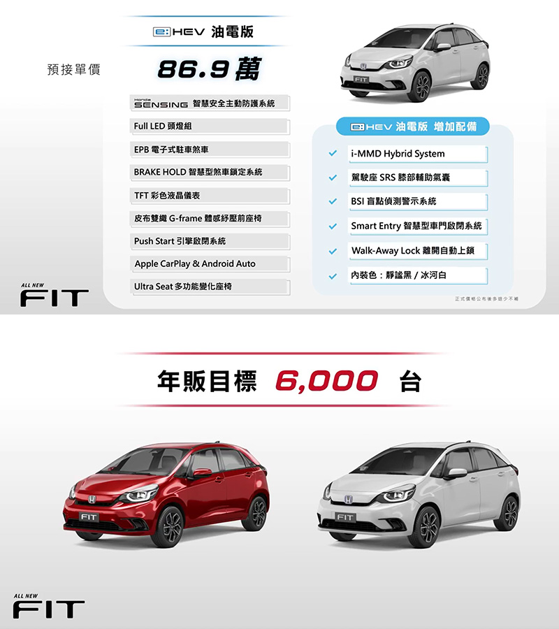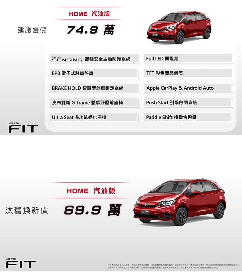 Award 2021 汽車產品設計獎」及「日本自動車殿堂-年度風雲車」等國際雙重殊榮肯定的全新世代Fit,HOME汽油版正式於9/10發表,並將於9/11店頭上市,正式建議售價NT$ 74.9萬元整,汰舊換新正式建議售價69.9萬。 e:HEV油電版將於12月正式登場,預接單售價NT$ 86.9萬元整、敬請期待。