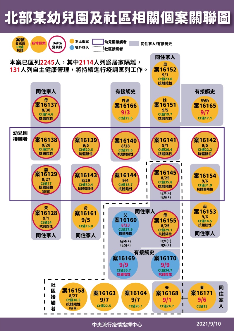 中央流行疫情指揮中心指揮官陳時中表示,2例本土病例中,其中1例在北市,為松山區就讀國中一年級學生(案16179),9月8日出現胸痛、呼吸痛等症狀,9月9日就醫採檢,於今日確診,目前學校已經停課,相關接觸學生、師長等,共51人,皆進行隔離。確診者還有一位就讀國小的妹妹,目前採檢結果為陰性。