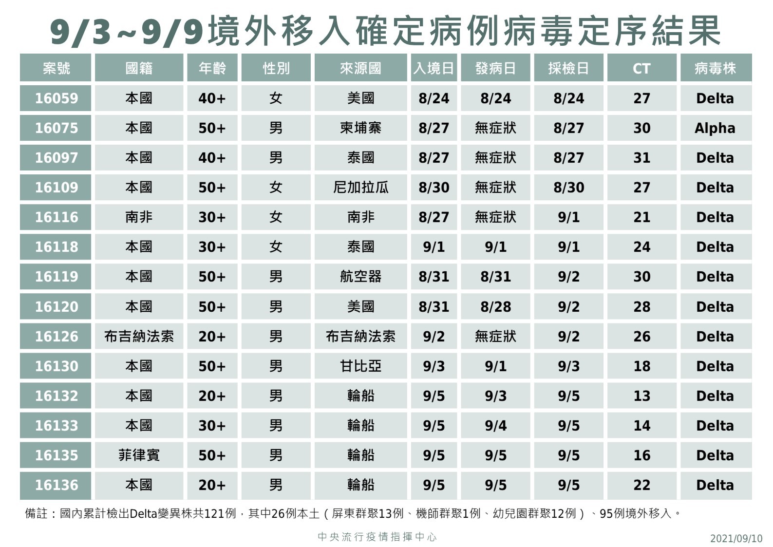 而新北市1例(案16173)為60多歲男性,於9月7日出現胸痛、輕微噁心、肌肉痠痛等症狀,9月8日就醫並採檢,於今日確診,目前已匡列接觸者6人,列居家隔離,持續匡列相關接觸者中,而目前感染源尚未明朗,衛生單位將持續進行疫情調查及防治。