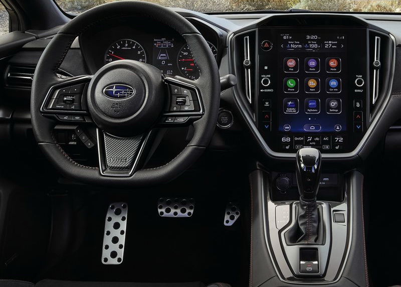 車艙部分依舊是那熟悉的斯巴達式內裝布局,但卻透過縫線配色、金屬踏版及WRX頭枕繡字帶出車款的不凡身分,不過最大進化還是導入了新世代車型專屬的11.6吋大面積Starlink中控螢幕,以貼近智慧型裝置的圖示與操作方式讓使用者能迅速就手,不過仍保留實體的音量操作與空調按鍵讓車主不必分心便能迅速調整些基本功能,支援藍芽傳輸及Apple CarPlay / Android Auto已是現代車款的基本條件,另外還提供選配更高檔的Harman Kardon音響系統,招牌的EyeSight駕駛輔助科技同樣為WRX在熱血操駕之餘提供最即時的安全守護。