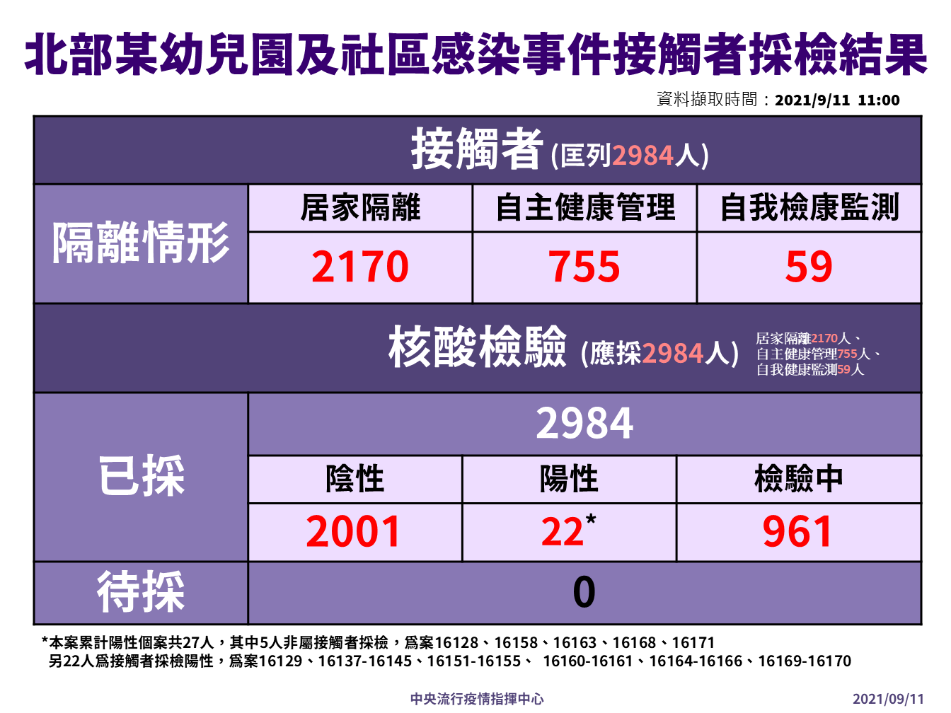 指揮中心表示,今日新增5例境外移入個案,為3女2男,年齡介於20多歲至50多歲,分別自南非(案16180)、越南(案16181至案16183)、日本(案16184)入境,入境日介於8月27日至9月9日。