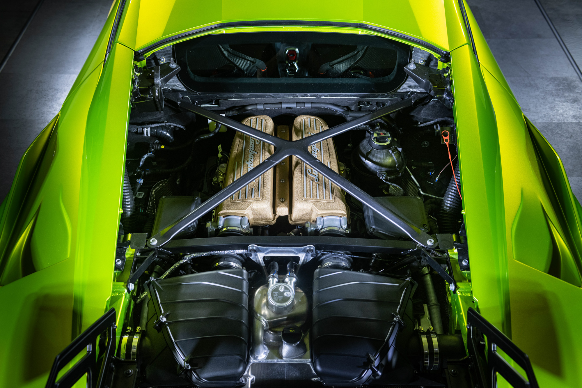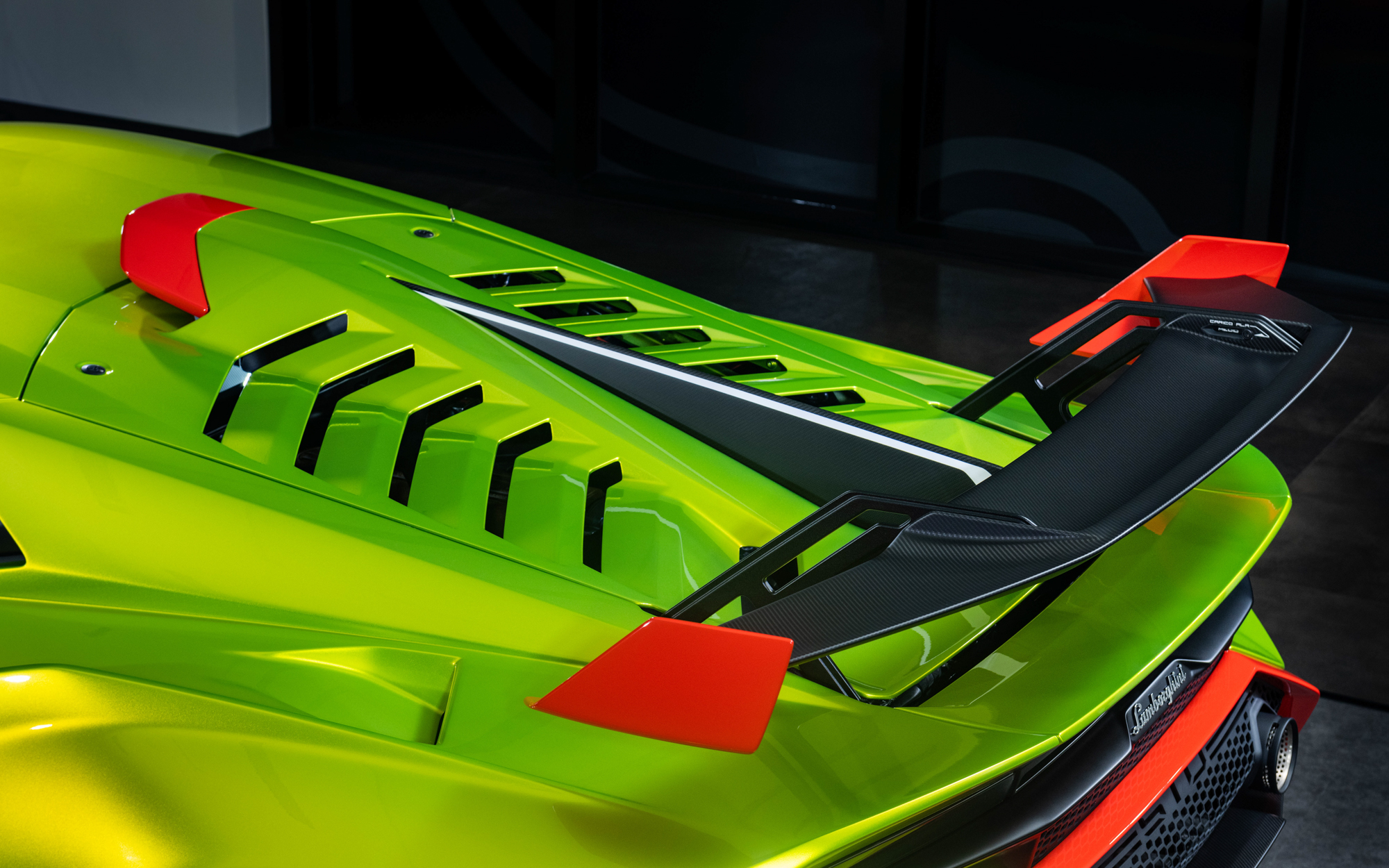 車尾設計取於Super Trofeo EVO的新型後葉子板,在減少迎風面積並降低風阻的同時,提升尾部下壓力,增進車輛整體空力效益;位於葉子板上的NACA進氣口,以更短的進氣通道為引擎室導入氣流,可減少30% 的靜壓力損失。重新設計的引擎蓋整合車頂進氣口,提升引擎冷卻效力,車頂進氣口造型往車尾延伸,形成彷若鯊魚鰭的中央背鰭設計,有助於提升車輛高速行駛及進彎時的穩定性,進一步優化整體動態性能。可調節式尾翼,可依據不同駕駛條件進行三段調整,以達到最合適的空力平衡狀態。