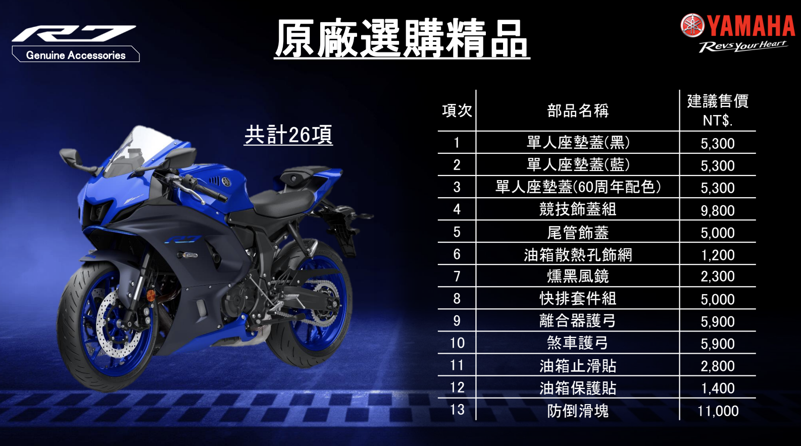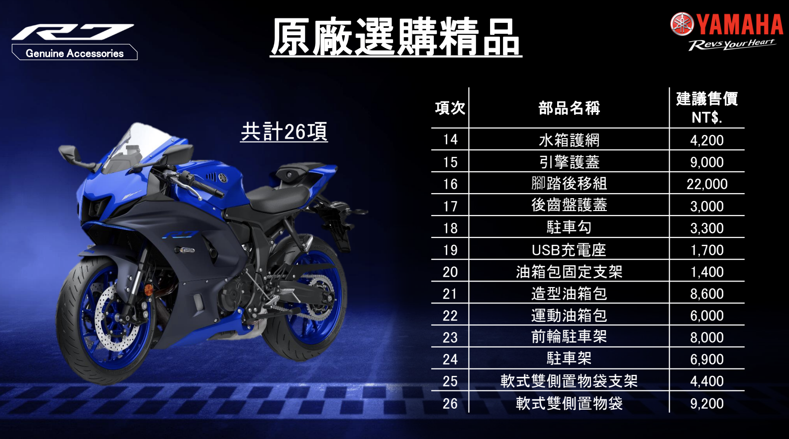 現場也展示 Yamaha 原廠選購精品,共計 26 項多樣選擇,從單人座墊蓋、防滑倒塊、煞車護弓、快排套件組、後齒盤護蓋、造型油箱包等一應俱全;同時展出 Yamalube RS4GP 頂級油品,擁有降低運轉阻力、極限操駕下的油品穩定性、直接的油門反應、更加換檔感受等優勢。