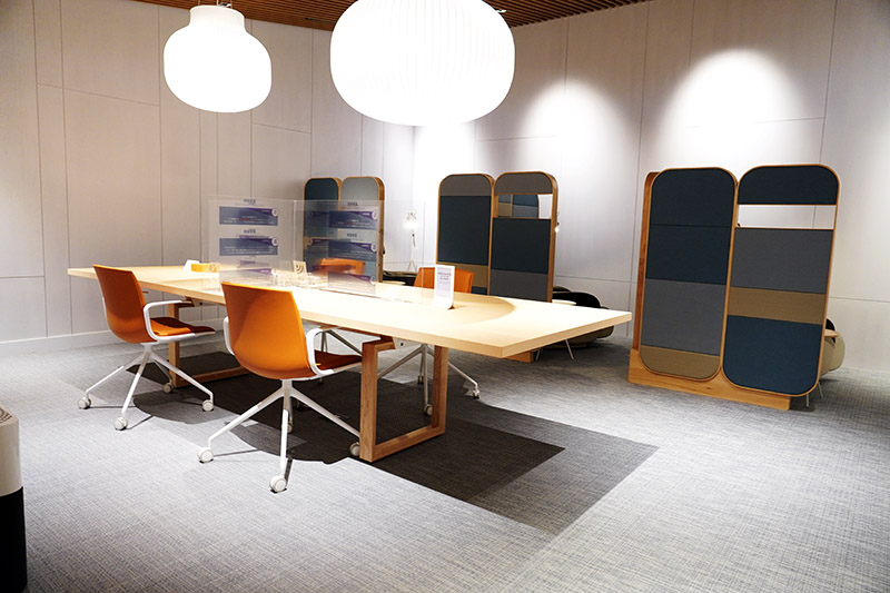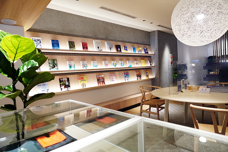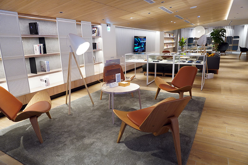 展間二樓的客休區整合個人休憩、商務辦公、兒童遊憩及精品展售等功能,融入斯堪地那維亞的簡約美學,配色用料取自原始自然元素,以溫潤木質色調及適量留白貫穿整體,北歐設計款家飾點綴其中。