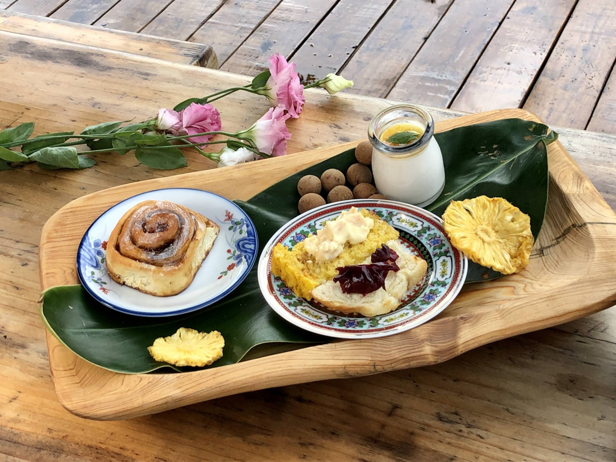國本農場目前採全預約制,除導覽、DIY香包之外也提供豐富的下午茶,自製洛神、芒果、金桔果醬酸甜剛好,搭配手作窯烤吐司,口感有嚼勁,而使用自己種的肉桂葉所做成的手揉肉桂卷有安神的效果,再來碗綠豆小米粥或一杯刺蔥冬瓜茶,每一口茶點都是最純粹的台東滋味。