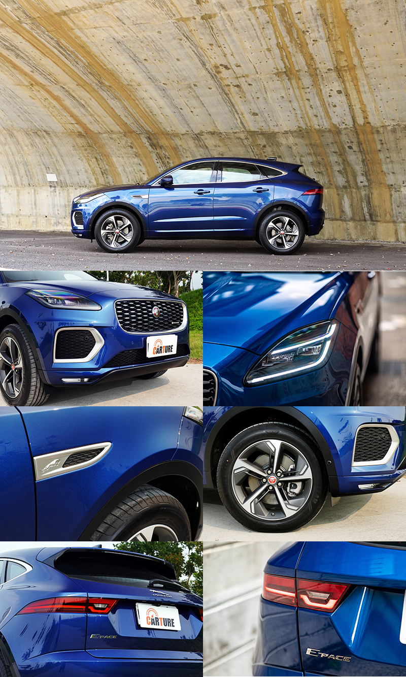 身為家族小老弟的E-Pace,在外觀上與家族兄弟相同,大量引用了當家跑車F-Type許多元素,都有著優雅流線的身形,車長僅4395mm的E-Pace,短捷尺碼讓它看起來更為緊實,肌肉感更明顯;而在外觀改變上,主要在車頭造型重新設計,家族化水箱護罩透過Jaguar經典六角格紋點綴,並在水箱護罩邊框與兩側進氣口邊框都採鍍鉻處理,使其更為顯眼,同時前、後照明系統同步升級搭載LED燈組,引進的R-Dynamic SE車型則標配全新設計的雙J型高階LED頭燈,兩道J型日行燈提升了辨識度,尾燈也同樣改變了燈光內的排列組合。此外,在前左右葉子鈑上的側飾板也加上了與F-Type相同的躍豹浮雕。