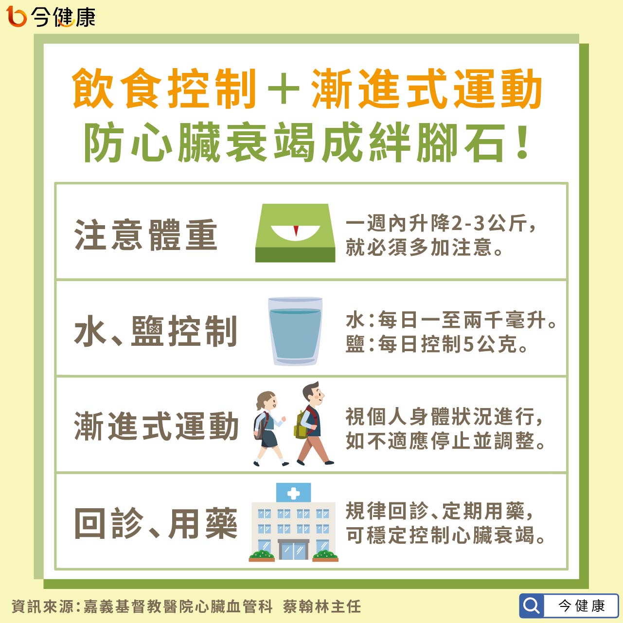 倘若已是心臟衰竭患者,嘉義基督教醫院蔡翰林主任表示,患者每日要注意體重變化,若體重一周內有2-3公斤的升降,就必須多加注意。以及平時也要控制水分與鹽分的攝取,鹽分攝取一日應控制在5公克,水分攝取建議一日約一千至兩千毫升,則運動每週可依照個人身體狀況進行,若運動中有出現身體不適,請立即停止運動且觀察身體變化,後續再依照身體能承受程度進行調整。