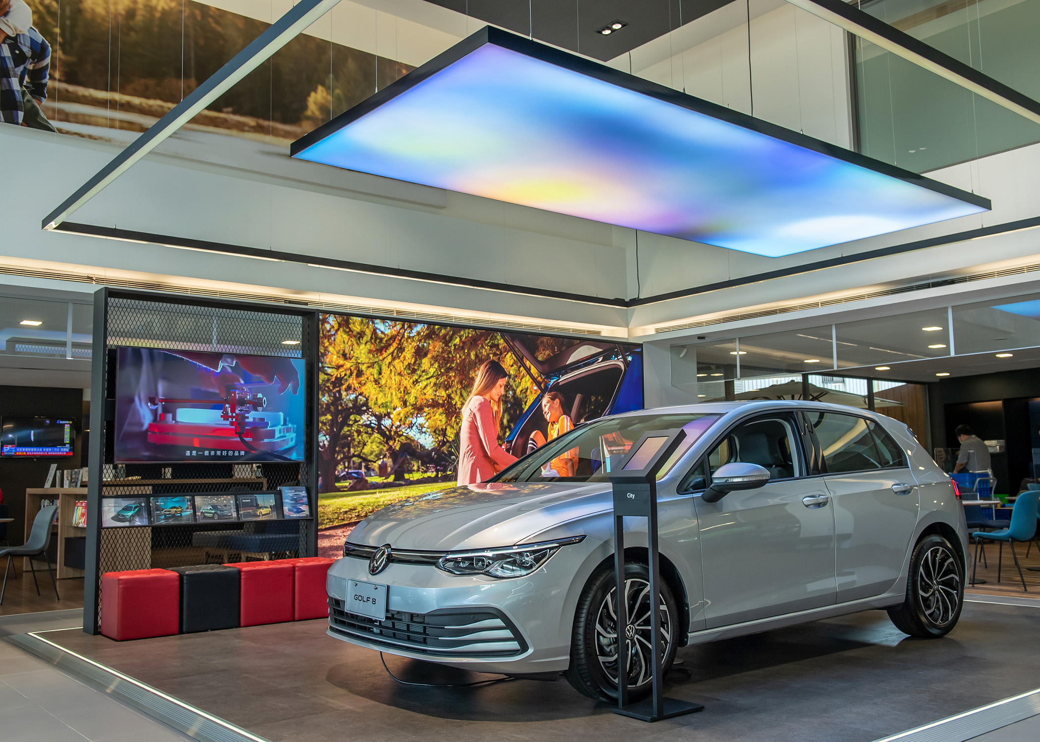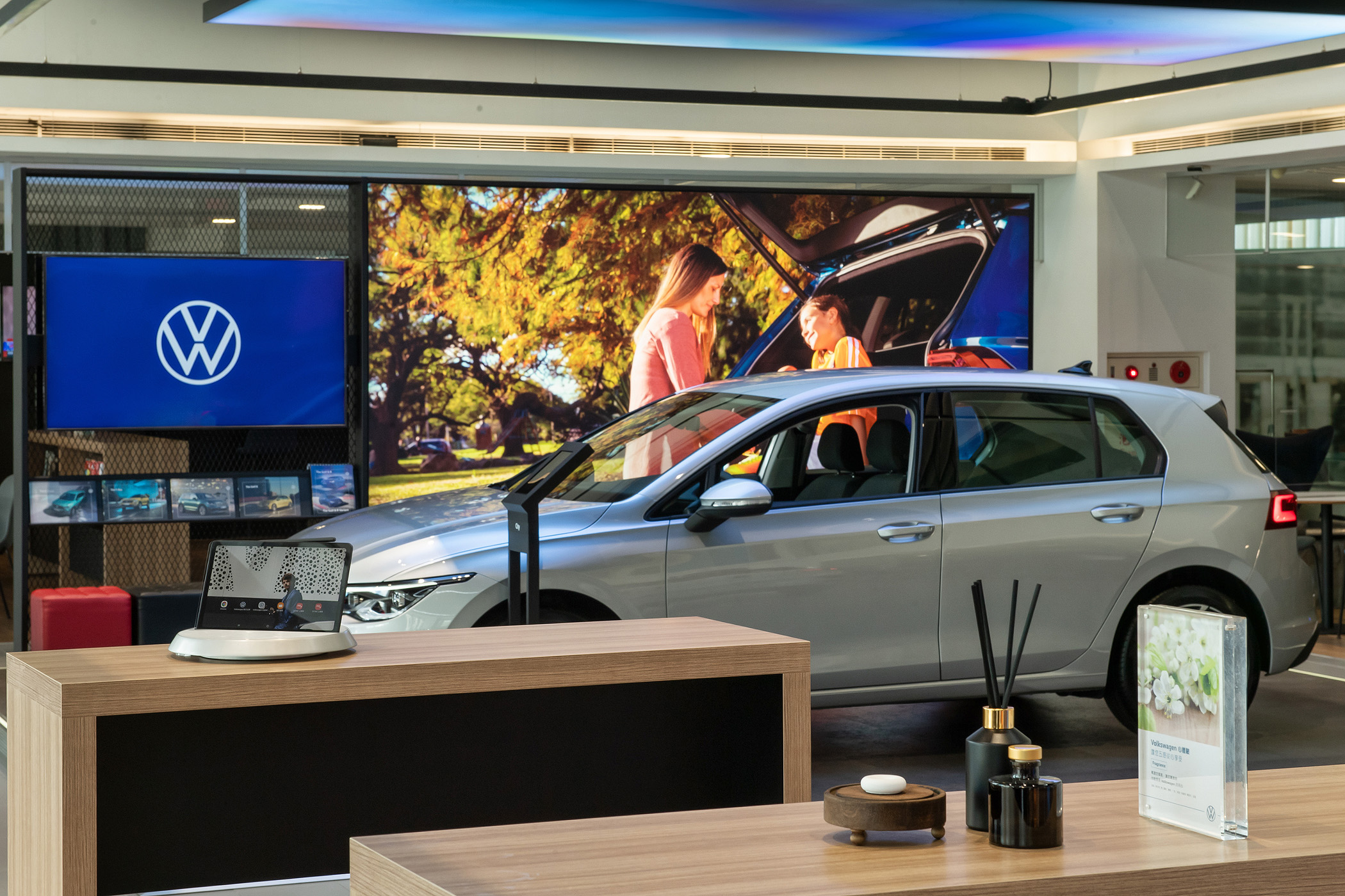 台灣福斯汽車遵循新品牌識別規範與全台經銷通路夥伴攜手打造全新展示中心,徹底提升軟硬體服務,經歷2年時程規劃、人員安排和德國原廠審核設計,以不影響日常營運的施工原則與效率,終於迎來嶄新的 Volkswagen 展示中心,室內設計運用豐富色彩、明亮光源和數位電子工具展現 Volkswagen 生氣蓬勃的品牌風格,當消費者走進展示中心,大型 Welcome Wall 電子歡迎看板取代了傳統歡迎牆,呈現自信活力的精神,揮別過往的接待櫃台,改以原木高吧桌作為接待區迎接消費者,營造親切開放的氛圍。