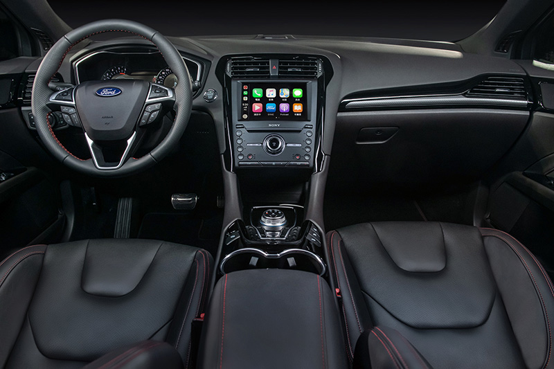 內裝部份採黑色車室內頂篷與鋁合金材質的前座迎賓踏板、油門及煞車踏板,讓駕駛在打開車門的瞬間,就感受到性能氛圍。其領先同級搭載多項舒適豪華與科技配備,包含:專屬皮椅配有運動化紅色縫線,並附雙前座10向電動調整及駕駛座三組記憶功能;配置10.1 吋全彩液晶儀錶,及搭載SYNC®3娛樂通訊整合系統的8吋LCD彩色觸控螢幕,支援Apple CarPlay®及Android Auto™[1],搭配原廠衛星導航系統,更添行車便利應用;Sony環繞音響系統與12 具揚聲器則為車室內乘員帶來劇場般的盛大聽覺饗宴;Mondeo ST-Line Wagon以中大型房車的優勢車格提供高效空間佈局,搭配電動尾門大幅提升實用性,其提供平整的行李艙空間,最高可達1,605L的多元運用空間機能。