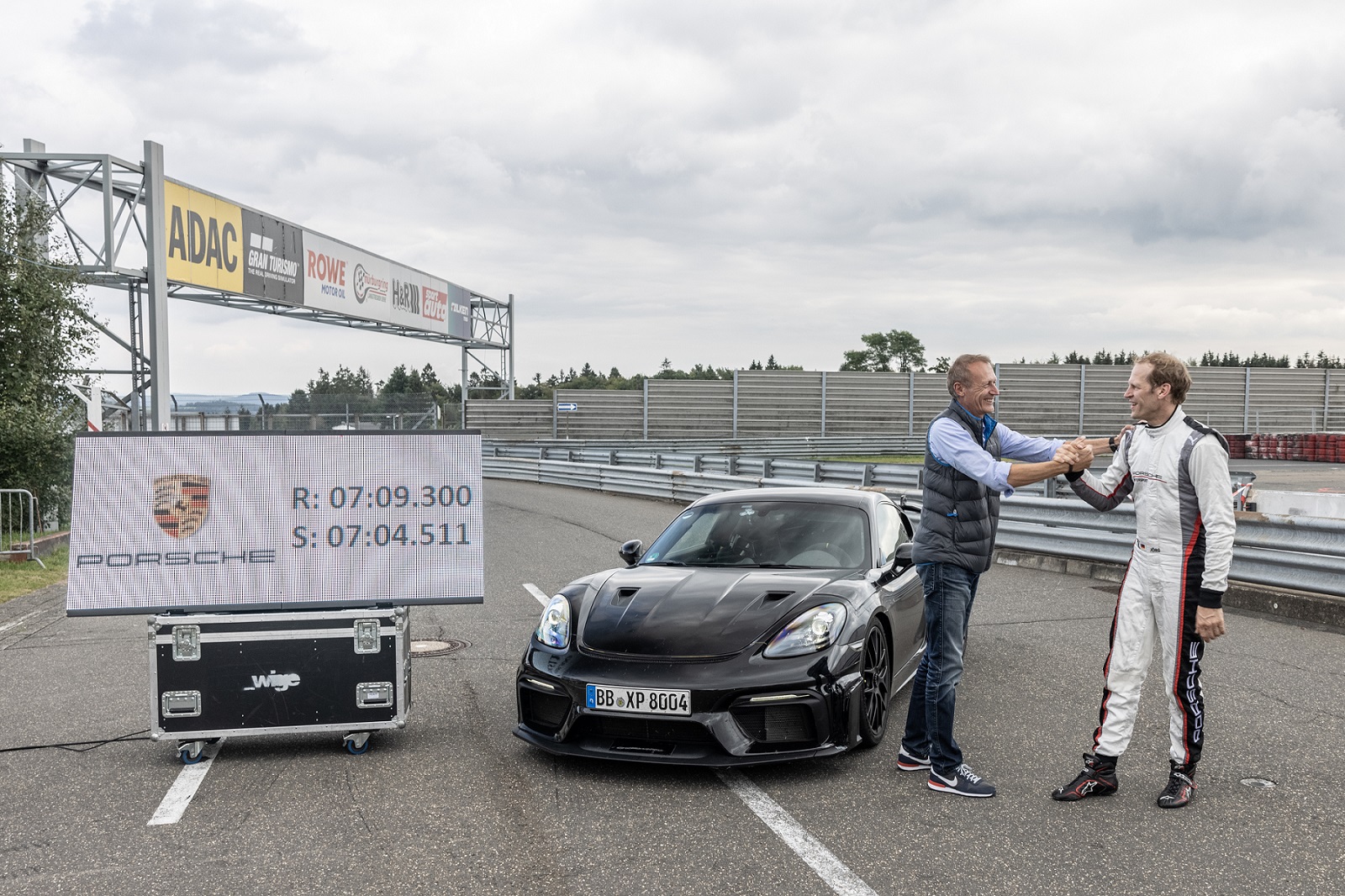 保時捷品牌大使暨測試車手 Jörg Bergmeister 駕駛著輕度偽裝的量產車,以 7 分 9 秒 300 的時間內完成了賽道全長20.832公里的紐柏林北環賽道挑戰。718 Cayman GT4 RS 更在 7 分 4 秒 511 內跨越了較短的 20.6 公里單圈賽程,成績比它的小老弟 718 Cayman GT4 快 23.6 秒。這款中置引擎跑車配備了賽車座椅以確保駕駛安全,輪胎則搭配了米其林 Pilot Sport Cup 2 R。此次測試亦有公證人在場確認車輛狀況及車身重量。