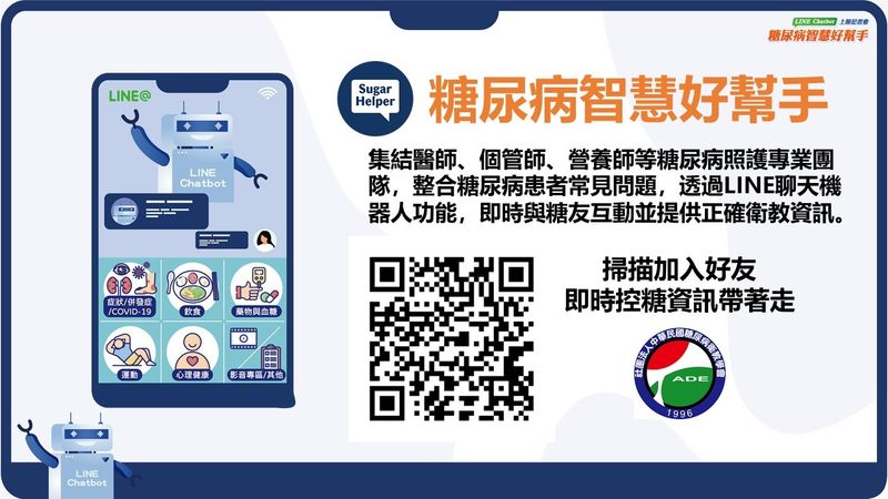 糖尿病衛教學會,為解決糖友資訊不滿足的困擾,整合現有衛教資源,以「糖尿病智慧好幫手」LINE衛教機器人與糖友即時互動,集結醫師、個管師、營養師等糖尿病照護專業團隊,彙整糖友常見的糖尿病共病、飲食控制、藥物使用、運動方式、心理健康及常見迷思,彙整成千筆資料的大題庫,糖友可以就自身疑問在「糖尿病智慧好幫手」發問並獲得即時回覆。