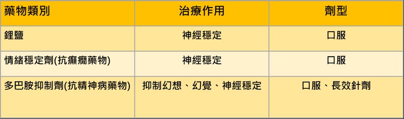 在躁鬱症治療與復發防治方面,目前有多種藥物可以運用。柯凱婷主任分析,治療躁鬱症主要有三大類藥物:第一類叫鋰鹽,主要功能在穩定神經。第二類稱為情緒穩定劑,屬於一種抗癲癇的藥,功能也是在神經穩定。第三種為多巴胺抑制劑,也稱為抗精神病藥物,可抑制幻想、幻覺,對神經穩定也有效果。