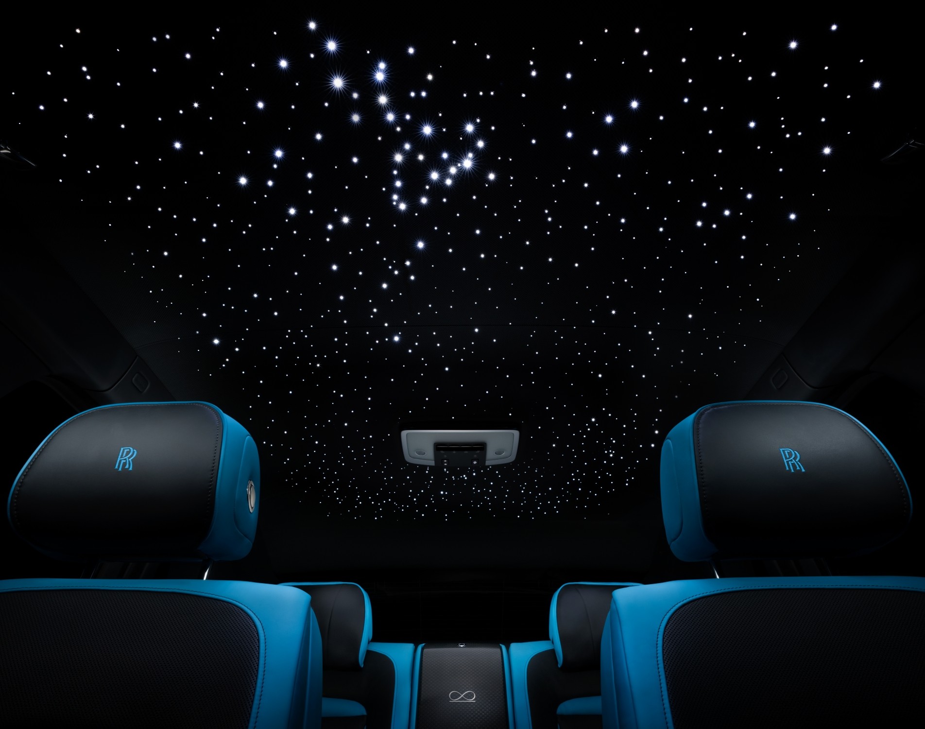 鐘錶兩側為全新 Ghost 獨有的創新設計—星光飾板,採用 850 顆點點繁星環繞著散發幽幽光芒的無限標識,星光飾板位於副駕駛一側,下方安裝 152 支 LED 燈源可點亮星光飾板,內飾燈光關閉時星空與標識完全隱形。其色調與車內鐘錶和儀錶照明和諧一致,而為保證標識光源均勻,LED 燈源採用厚度為 2 毫米的光導,表面配有逾 9 萬個鐳射蝕刻點,不僅保證標識被均勻點亮,更模擬星空閃爍的效果,視線所及點點繁星,與星光頂篷遙相呼應。
