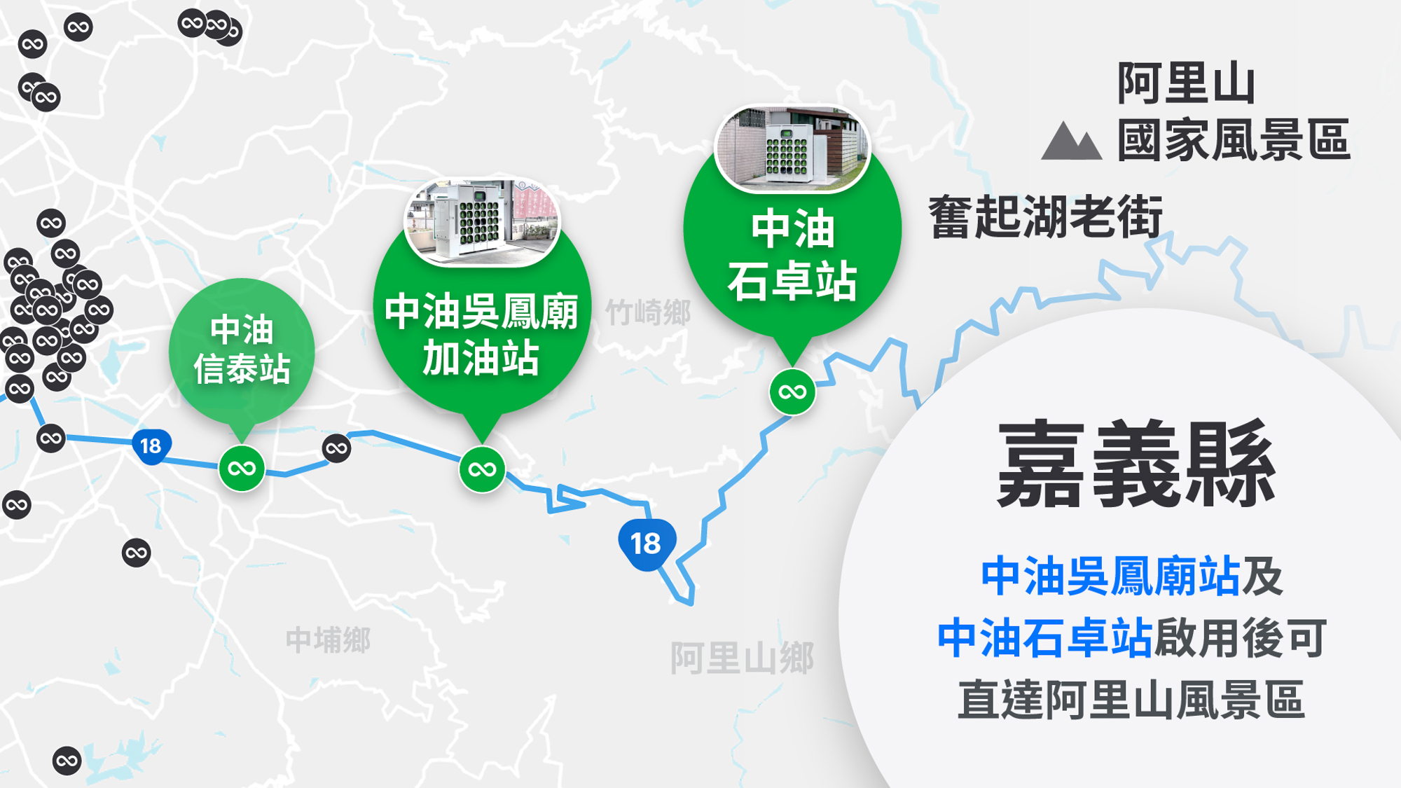 今日 Gogoro Network 也加碼宣布,預計 11 月底前完成阿里山公路(省道台 18 線)直達阿里山風景區的電池交換站佈建,沿路新設立的 GoStation 站點包括:中油信泰站、中油吳鳳廟站及中油石卓站,在阿里山公路沿線投放超過 80 顆電池,讓全台各地的 PBGN 車主能夠以省道台 1 線、台 9 線搭配台 18 線,隨時啟程近身體驗無與倫比的阿里山美景。