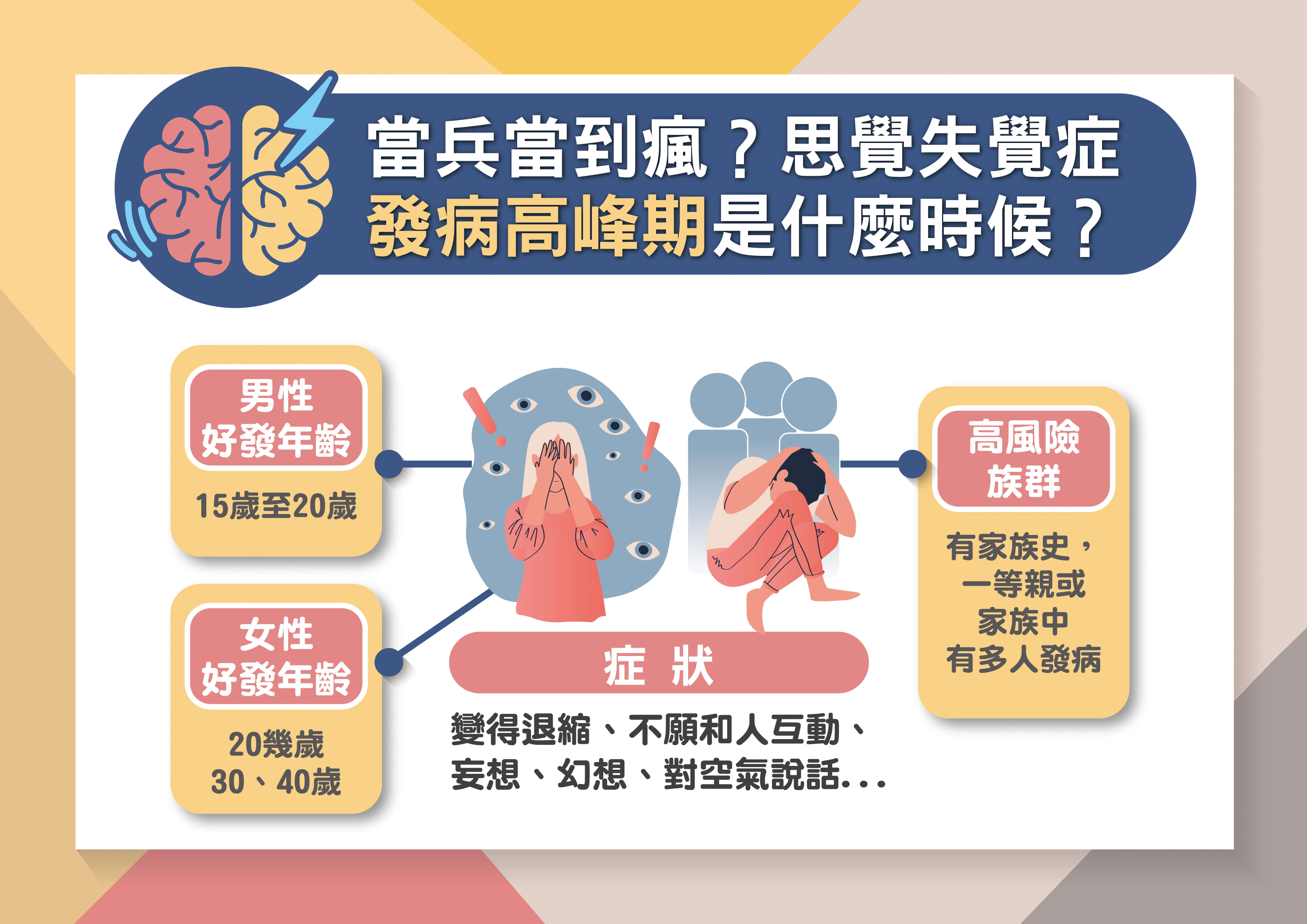 思覺失調症是一種大腦神經傳導物質異常的疾病,男性好發於15至20歲,女性好發於20-40歲,患者容易出現幻聽、妄想、焦慮、混亂性言語與行為。中山醫學大學附設醫院身心科醫師廖尹鐸表示,思覺失調症就像是大腦著火了,如果在火苗零星發作時趕緊控制病原,大腦的整體功能可做不錯的保存;反之,如果發病後完全沒有進行治療,火勢擴大甚至一發不可收拾,五年、十年之後,大腦功能退化嚴重,這個時候藥物介入的效果相對有限。目前臨床建議思覺失調症病友的治療要趁早,把握初次發病後的黃金5年,持續治療且維持體內藥效穩定,有助避免病情復發。