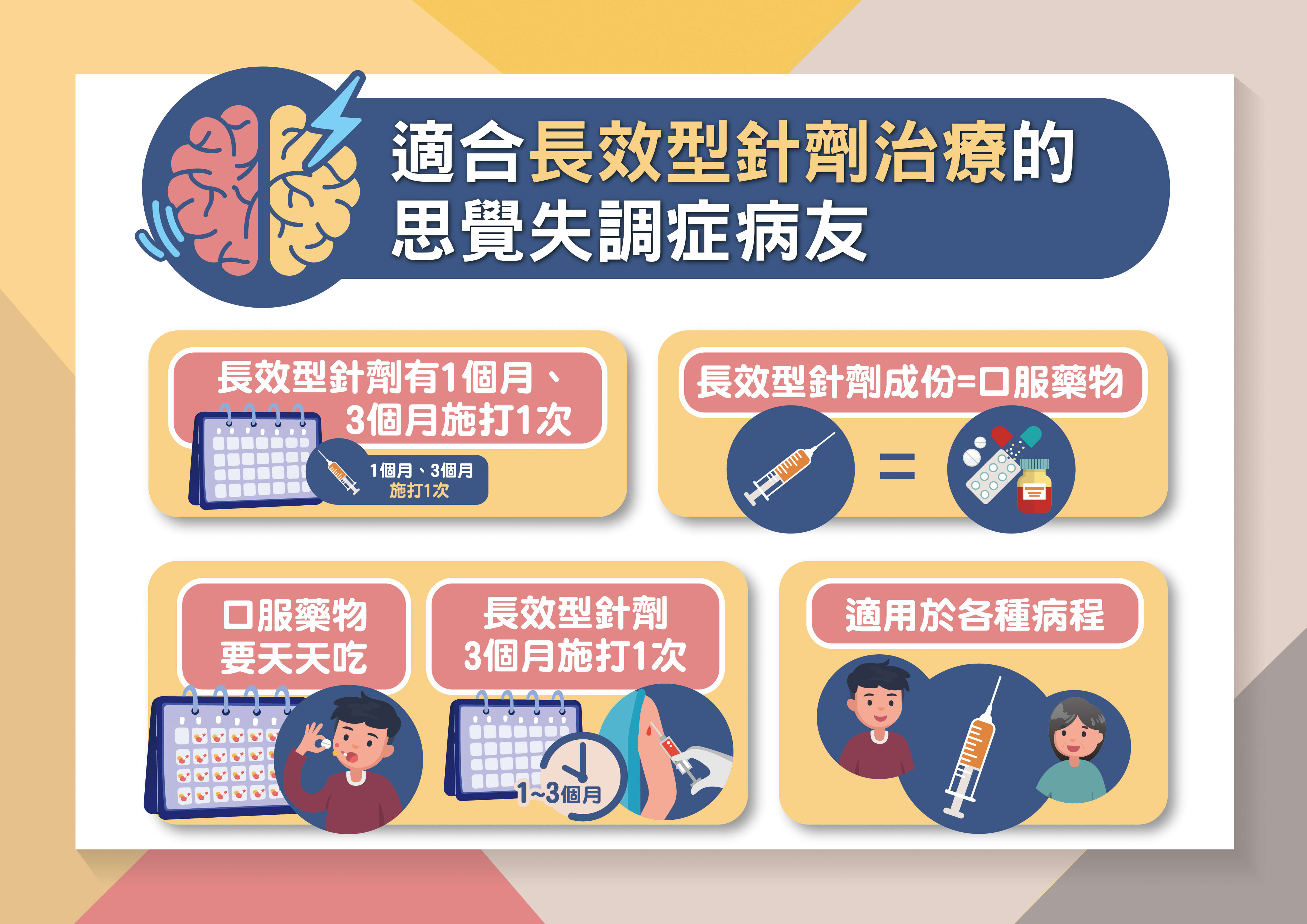廖尹鐸醫師表示,思覺失調症藥物有口服和針劑兩種,其中長效針劑從兩周到三個月一針的都有。台灣生物精神醫學會暨神經精神藥理學學會(TSBPN)專家共識建議,病友初次發病使用長效針劑,可以避免病友忘記服藥或每天猶豫要不要吃藥的疑慮,醫師也可以根據患者用藥順從性給予不同針劑用藥建議,病友只要固定時間打針,體內的有效濃度保持穩定,就能使病情控制在良好的狀態。
