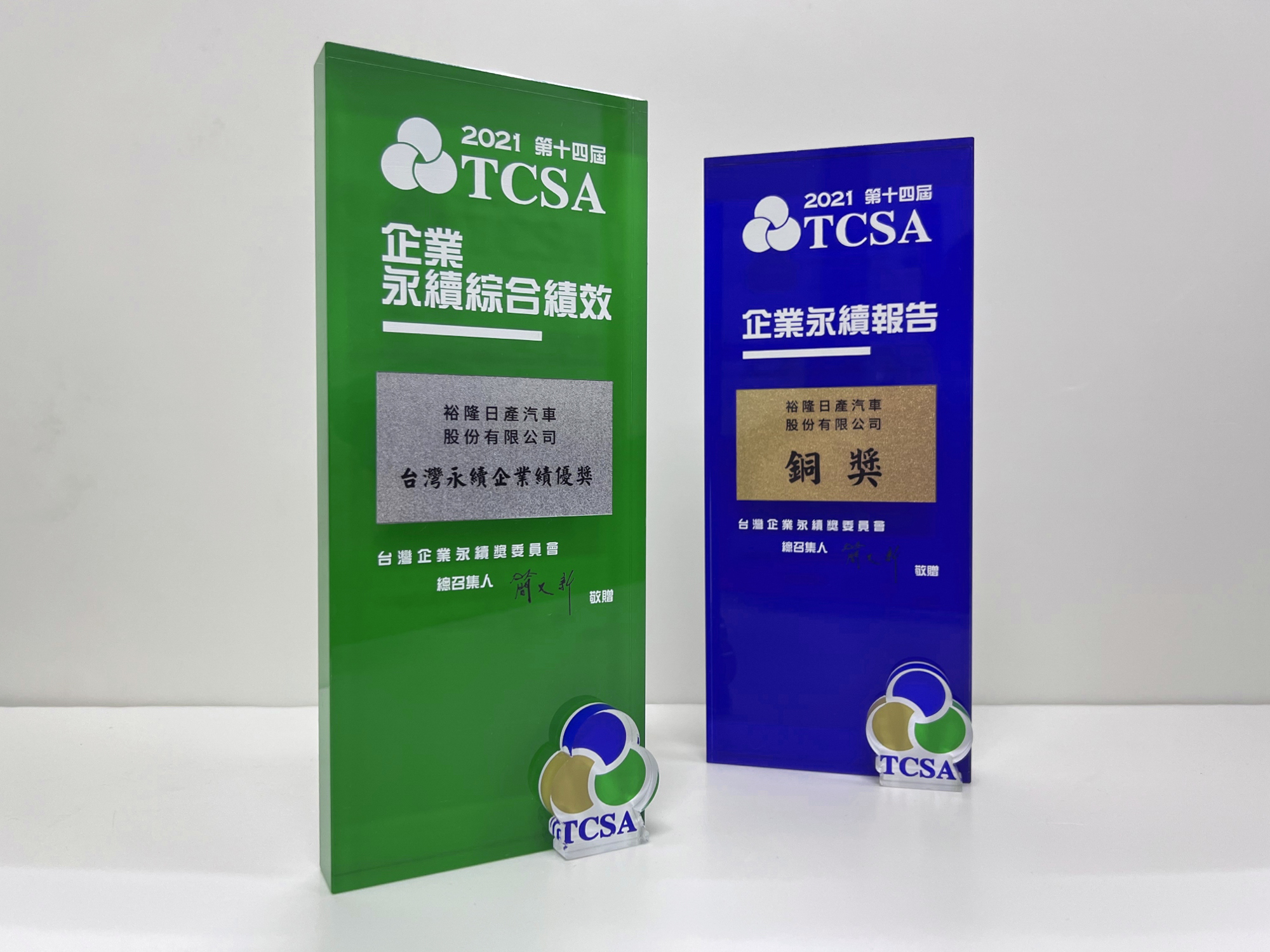 2021 年第十四屆 TCSA 台灣企業永續獎於 11 月 17 日舉辦頒獎典禮,裕隆日產汽車榮獲「台灣永續企業績優獎」及「企業永續報告獎-服務業銅獎」,由立法院游錫堃院長親自頒獎、裕隆日產梁肇彥協理代表受獎。