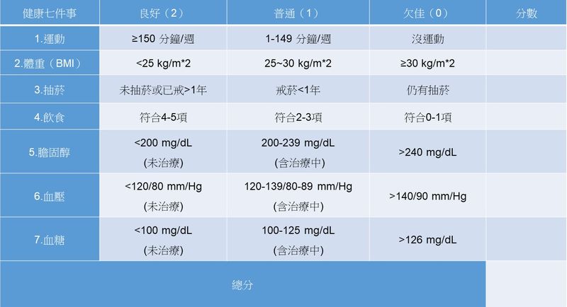 ▲人生健康七件事:運 重 煙 食 醇 壓 糖(健康飲食指數參照表:https://www.strokecare.org.tw/share49.html)