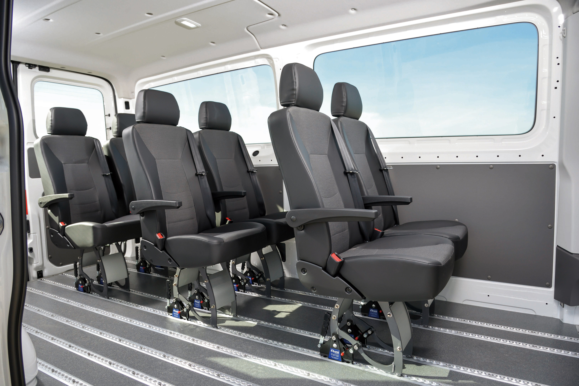 Crafter 長軸高頂九座客車。 後艙空間中,全新 Crafter 九人座客車無論是中軸平頂或長軸高頂,都配備「聰明變」鋁合金無段式滑軌地板,並且標配採用快拆設計及安全帶配備的 6 組單人獨立座椅,可依照不同需求自行調整座椅位置,為乘客提供舒適的乘坐空間。全新 Crafter 並標配後艙獨立空調以及出風口。