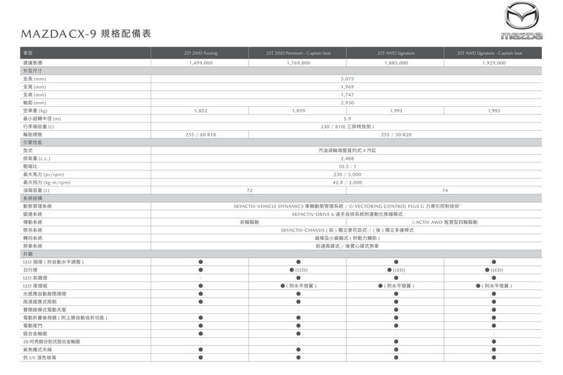 日系進口正6/7人座CX-9的大器外觀與豪華質感,一直以來深受層峰客層青睞,作為旗艦休旅的市場標竿,CX-9本次導入全新獨立雙座旗艦座椅,提供更多元的座椅配置,豪華格局再度進化,全車系以149.9萬起的正式售價接單上市,獻給每位品味講究的車主。欲了解更多新車相關訊息與規格配備,歡迎造訪Mazda官方網站 (https://www.mazda.com.tw/)或親臨Mazda全國展示中心。