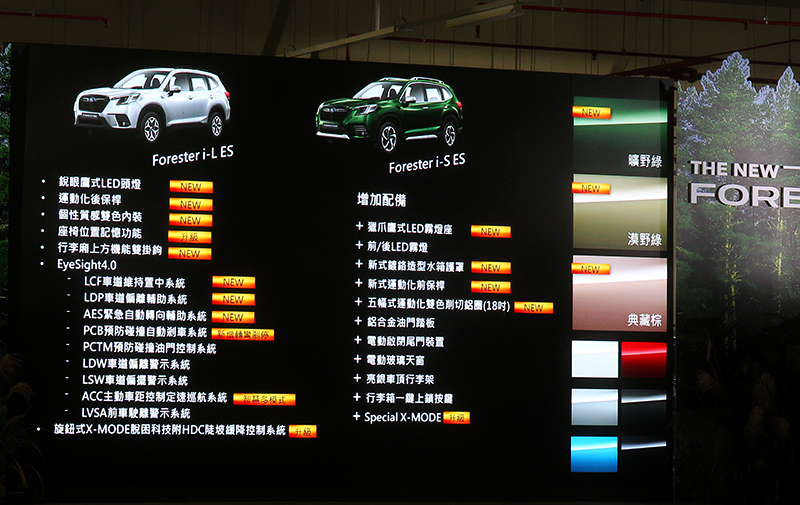 內裝部分則以多元素的材質鋪陳為主,搭配個性雙色內裝、駕駛座椅位置記憶功能,打造質感與舒適度兼備的乘坐氛圍。此外,Forester更新增行李廂上方機能雙掛勾(單一掛勾可乘載3公斤重物),無論是露營、釣具、登山、潛水、單車相關戶外生活用品,皆可貼心放置。Forester本次新增「曠野綠」、「漠野綠」和「典藏棕」三種大地系列車色,為消費者打造獨一無二的戶外運動休旅坐駕。