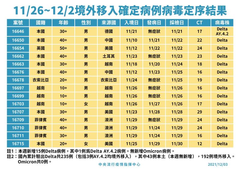 【健康醫療網/記者賴欣平報導】指揮中心說明,今日無本土病例,但本週境外移入病例經基因定序後,再新增15例Delta,其中包含一例Delta Plus變異株「AY.4.2」,為自德國入境之本國籍病例。指揮中心醫療應變組副組長羅一鈞指出,國內至目前為止累計驗出三例Delta Plus變異株,針對境外移入病例也持續施作基因定序,屏除病毒量過低無法定序的病例之外,有定序出的結果都會藉由指揮中心每日記者會公布,慶幸的是目前並無出現Omicron病例。