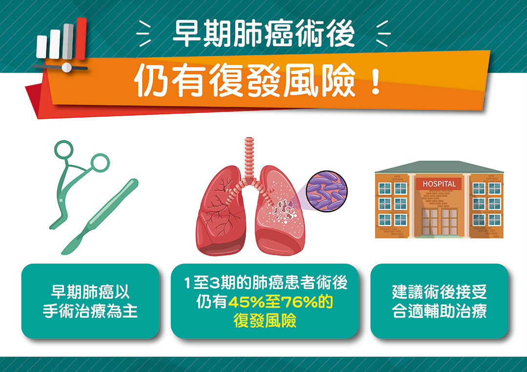 相較之下,早期肺癌若能透過手術切除,五年存活率高達5至6成以上。他進一步說明,早期肺癌中,腫瘤病理分期屬於零期或是一期(A)等,手術後大多不須接受術後輔助治療,但是約10%患者屬於一期(B)到二期,若能在術後搭配輔助治療,可以大幅降低復發風險、提升五年存活率。