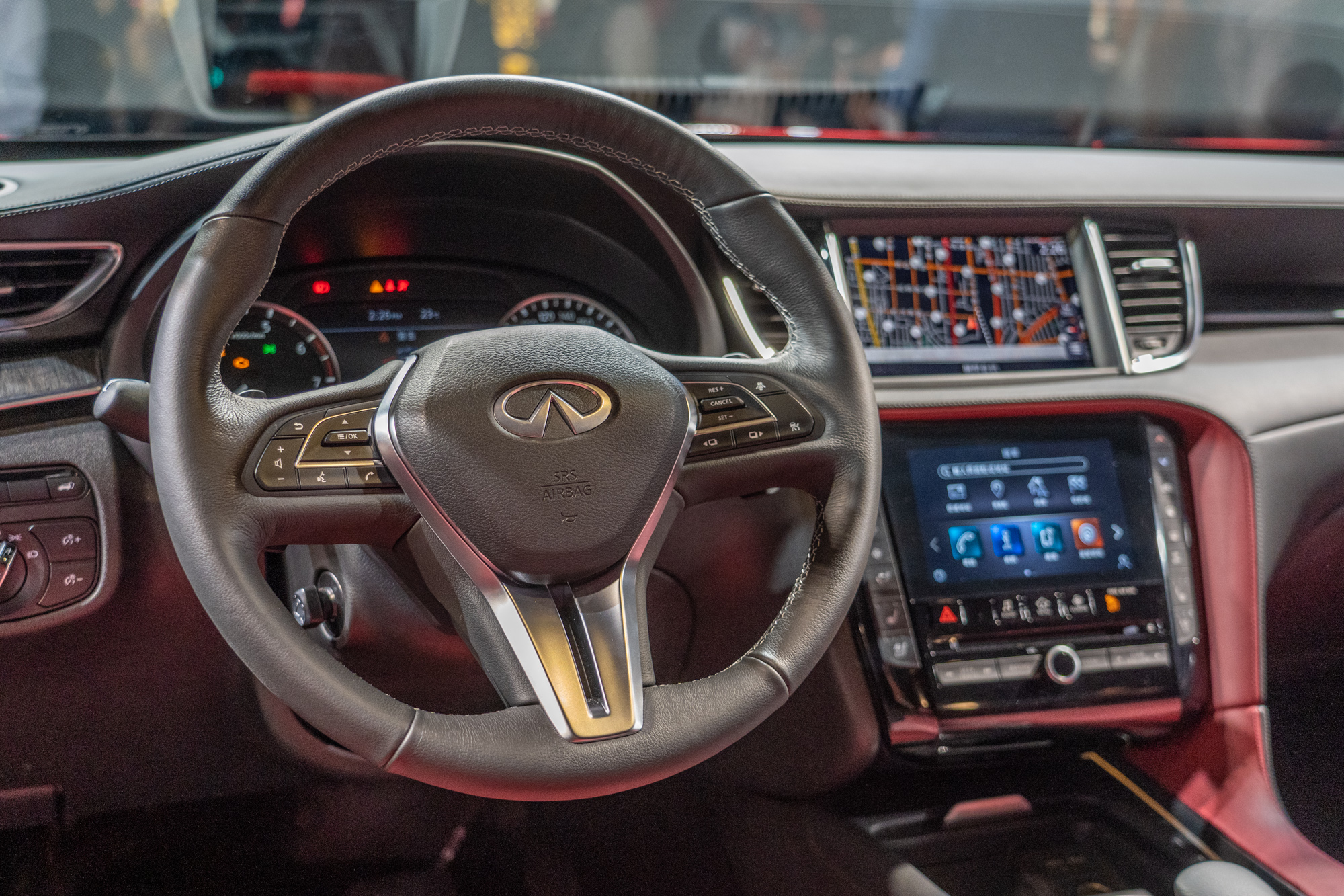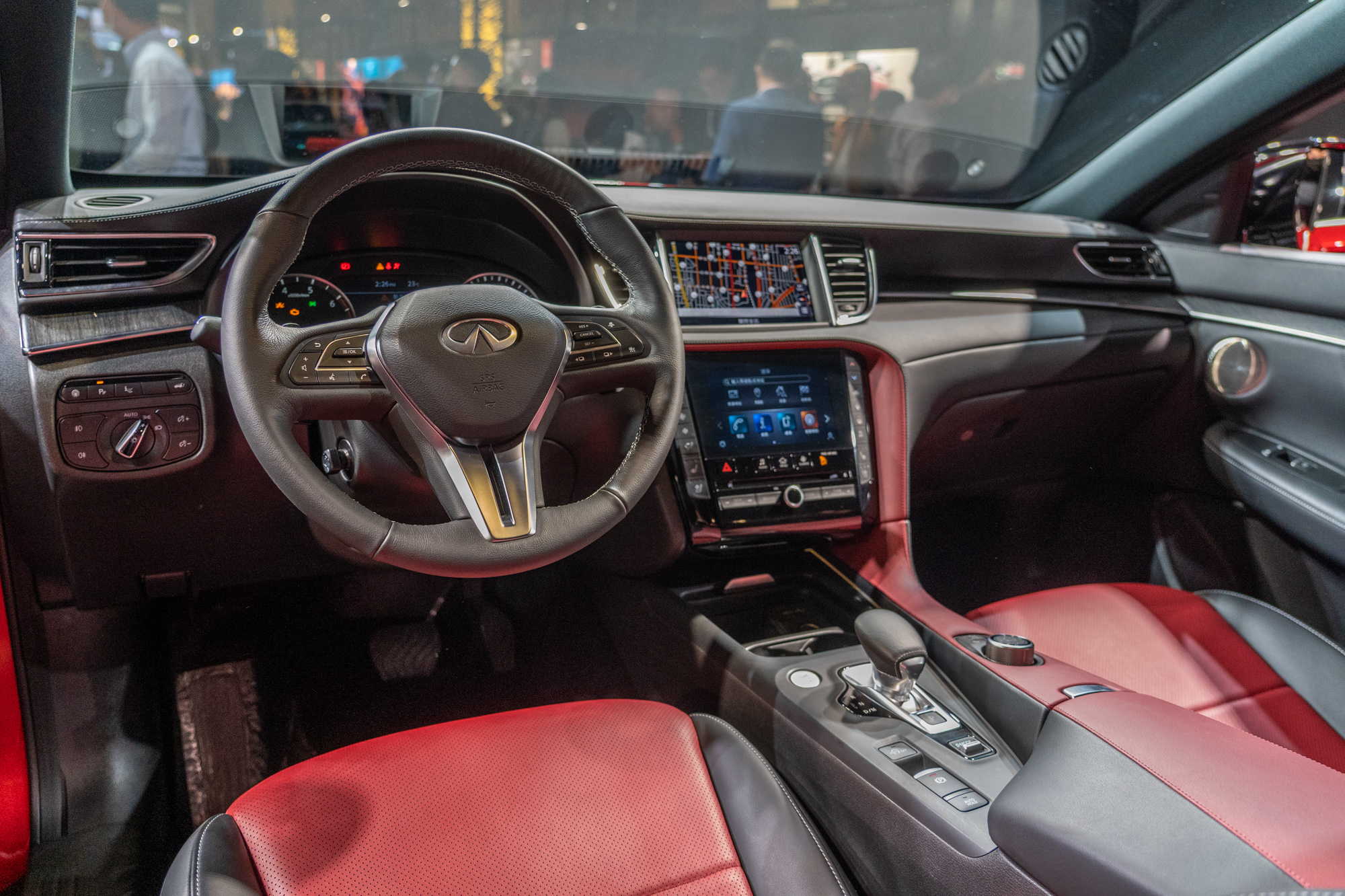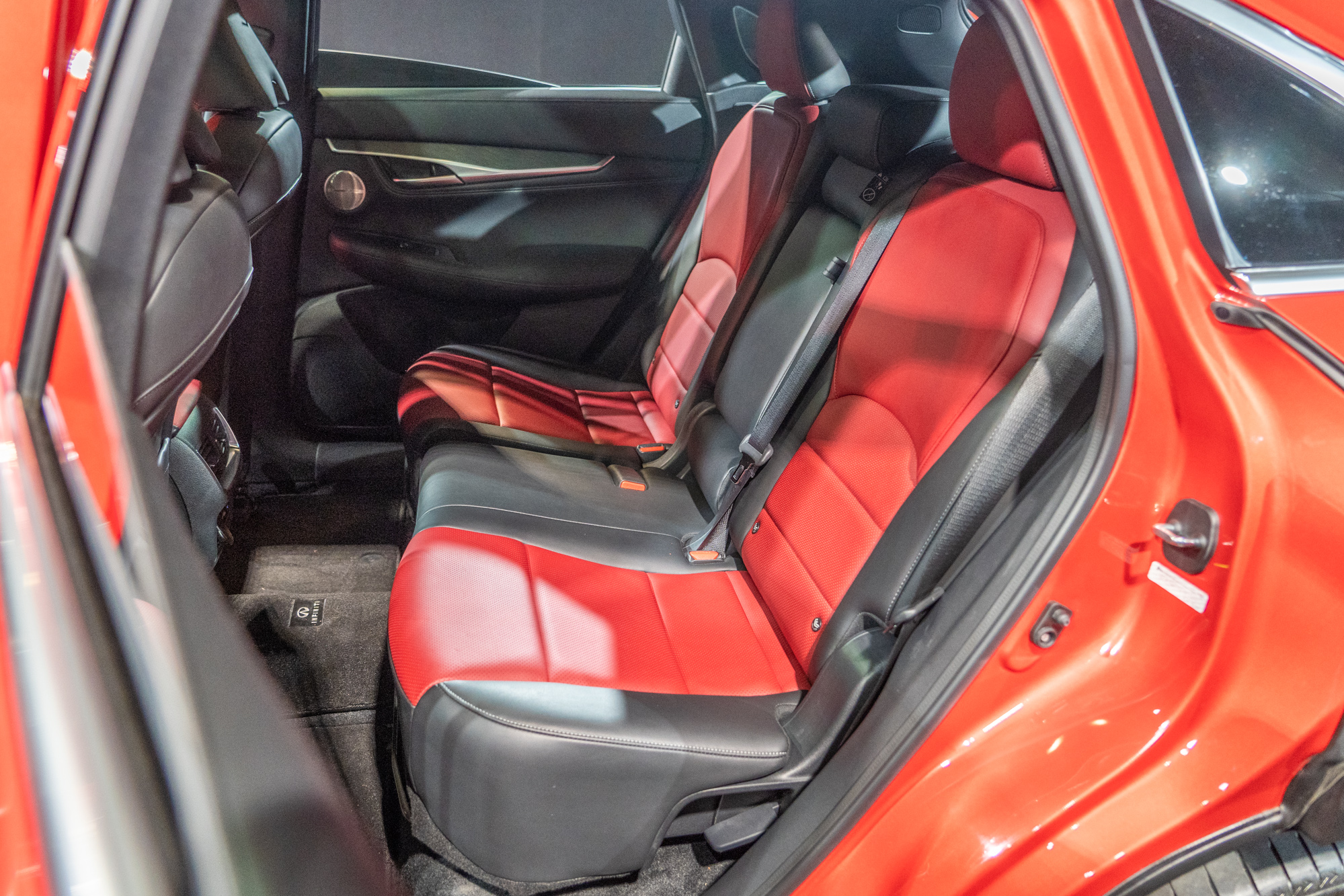 QX55 內裝空間展現體貼、細膩的設計,考量使用者舒適性與機能,設計廣闊的後座空間及行李箱空間,行李箱空間最大可擴展至 1531L,滿足各種裝載需求。後座採用前後可滑動式座椅,前後滑移可達 15 公分及椅背傾斜多段式調整。車內配備 16 具 BOSE Performance 揚聲器,針對車室進行聲學分析,決定揚聲器最佳分配位置,將 QX55 打造成頂級行動音樂廳。