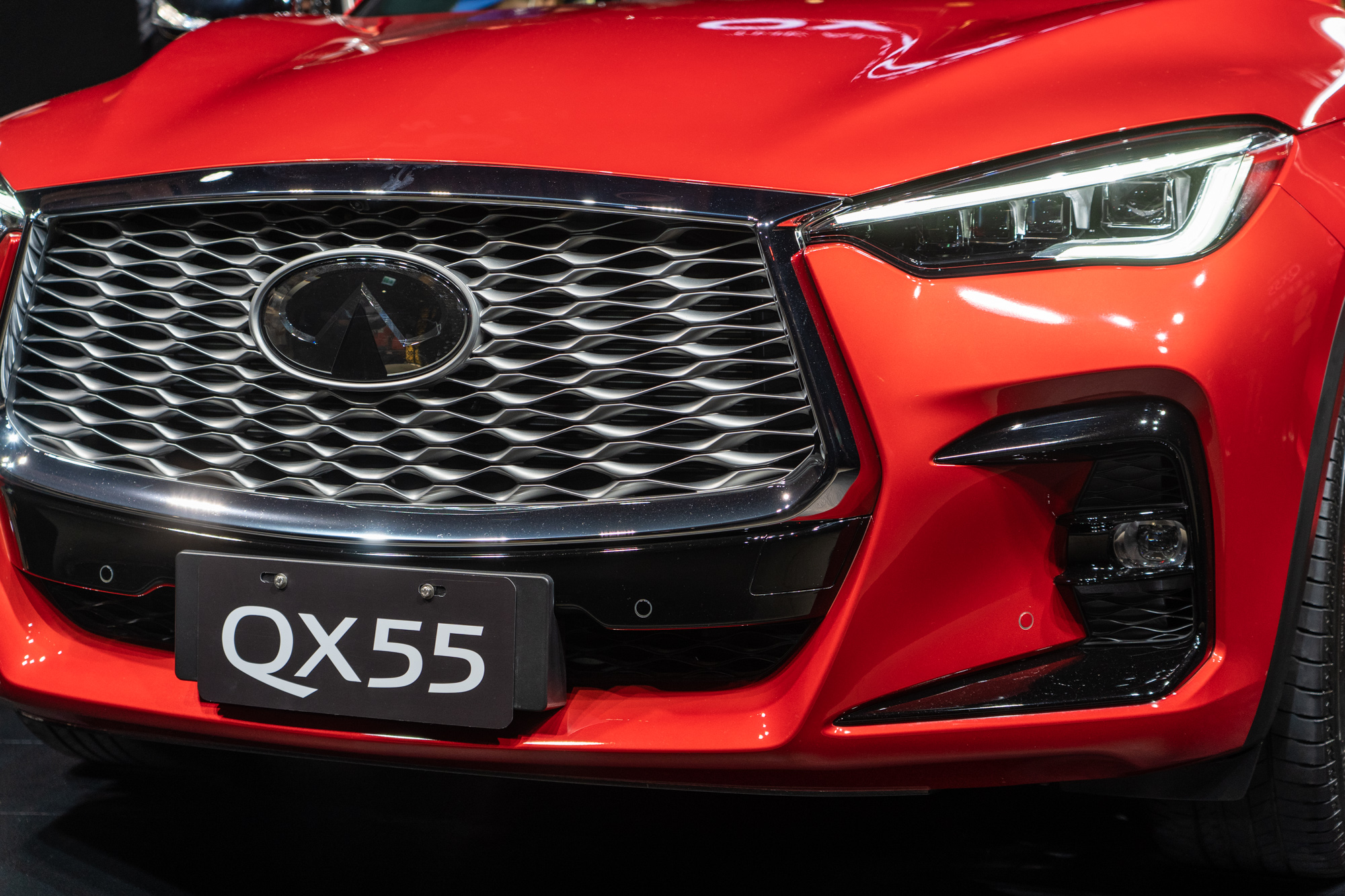 QX55 車頭的雙弓式星梭水箱護罩格柵以日式摺紙工藝為啟發圍繞車頭 LOGO,搭配造型銳利的仿人眼LED頭燈設計展現霸氣;車側至車尾的大膽流線湧浪式設計,下切式 D 柱設計呈現跑格造型,賦予獨特外觀美學;車尾採用最新 LED 琴鍵式尾燈,巧妙將科技與流體線條結合,兩側各以 45 顆高品質 LED 燈組成,結合琴鍵曳光設計均勻發光,不論任何角度皆展現時尚、大膽的跑格設計,更配備隱藏於尾門 LOGO 上的一鍵式車尾起閉按鈕。