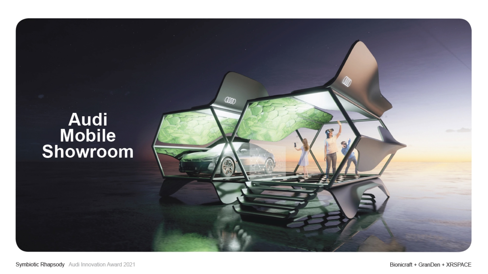 2021奧迪創新獎,最終由研發廚餘轉化處理的生物實驗室 Bionicraft、擅長打造虛擬偶像的 GranDen、專精於虛擬人像社交平台的 XRSPACE 三家新創團隊,以「共生的狂想」(Symbiotic Rhapsody)概念榮獲金獎;金獎團隊巧妙融合台灣在地的百合、苔癬和蜻蜓的材質和樣貌,運用在行動展間外部的結構設計上,展間內部則使用 AI 虛擬導覽和 VR 頭盔,建立與世界各地展間的互動,提供消費者跨越國境的連結與體驗。台灣奧迪總裁安薩瑞看到金獎團隊的概念表示:「此次得獎的創新結合了數位他和永續性的概念,非常地另人印象深刻。得獎的團隊也展現了絕佳的合作精神,這正是Audi不斷地在追求和各界共用點作創造未來的可能性,這也正是我們和台 灣新創圈期待的合作模式,一起追求創新的方式來邁向未來。」