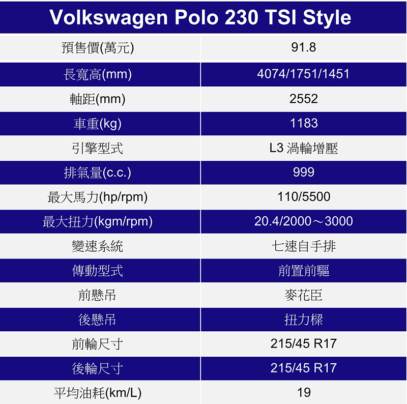 小改Polo動力仍搭載1.0升三缸渦輪引擎,維持相同的110hp/20.4kgm輸出,但是油耗部分卻提升至19km/L,在享有輕快加速反應也不用擔心油耗無情啃食你的荷包,只是若從四缸跳槽過來的要適應一下引擎啟動瞬間帶來的震動。