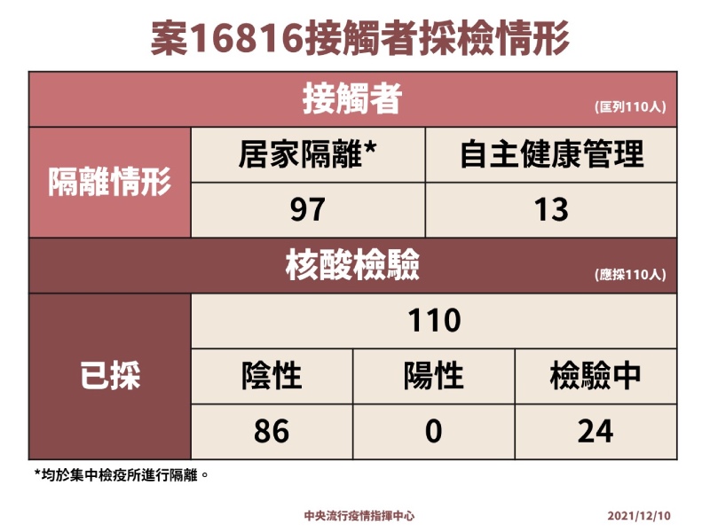 案16816原為中央研究院員工,離職隔日確診,陳時中說明,區管中心及地方衛生局昨日晚間已積極匡列接觸者並隔離,全部到集中檢疫所隔離採檢,目前有97人居家隔離、13人自主健康管理,此110人當中,86人為陰性,24人檢驗中。陳時中也提醒,檢驗為陰性者不代表未染疫,可能為尚未發病,仍需要進行隔離。