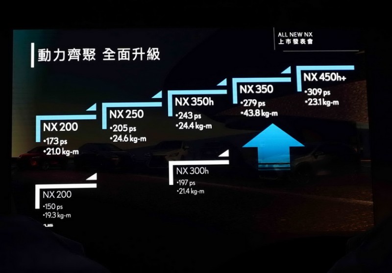 因應Lexus電動化時代的佈局,NX也首度導入品牌第一款插電式油電複合動力NX 450h+ (PHEV),其採用2.5升插電式油電複合動力,並搭載18.1 kWh的大容量鋰電池,提供優異的純電行駛里程及加速性能表現,更配備E-Four AWD電子式四輪傳動系統,強化450h+的整體操控表現。而NX 350h (HEV)則採用2.5升油電複合動力,捨棄現行的鎳氫電池,改採高效鋰電池模組,體積小輸出大,可完全配置於後座座椅下方,解決過去電池壓縮行李箱空間之問題外,並大幅提升350h的綜效馬力表現。而為了滿足顧客多樣化的需求,Lexus也首度推出NX 350,採用集團全新開發的2.4升渦輪引擎及Full-time AWD全時四輪傳動系統,以充滿熱血的動力與絕佳的循跡表現,賦予駕駛者更高的操控自信,盡情享受NX所帶來的駕馭樂趣。此外,在預賞會上證實特別為台灣開發保留的NX 200車型,也順理成章地在這次發表會上成為全球首發,其採用2.0升自然進氣引擎,馬力較現號進一步提升至173匹(ps),同時兼具絕佳的油耗表現來到15.8 km/L,更優於現行的NX 300h車型,勢必將成為豪華SUV的熱門選擇。而有較大動力需求之消費者,亦可選擇2.5升自然進氣引擎,徹底全面滿足不同客層的需求。