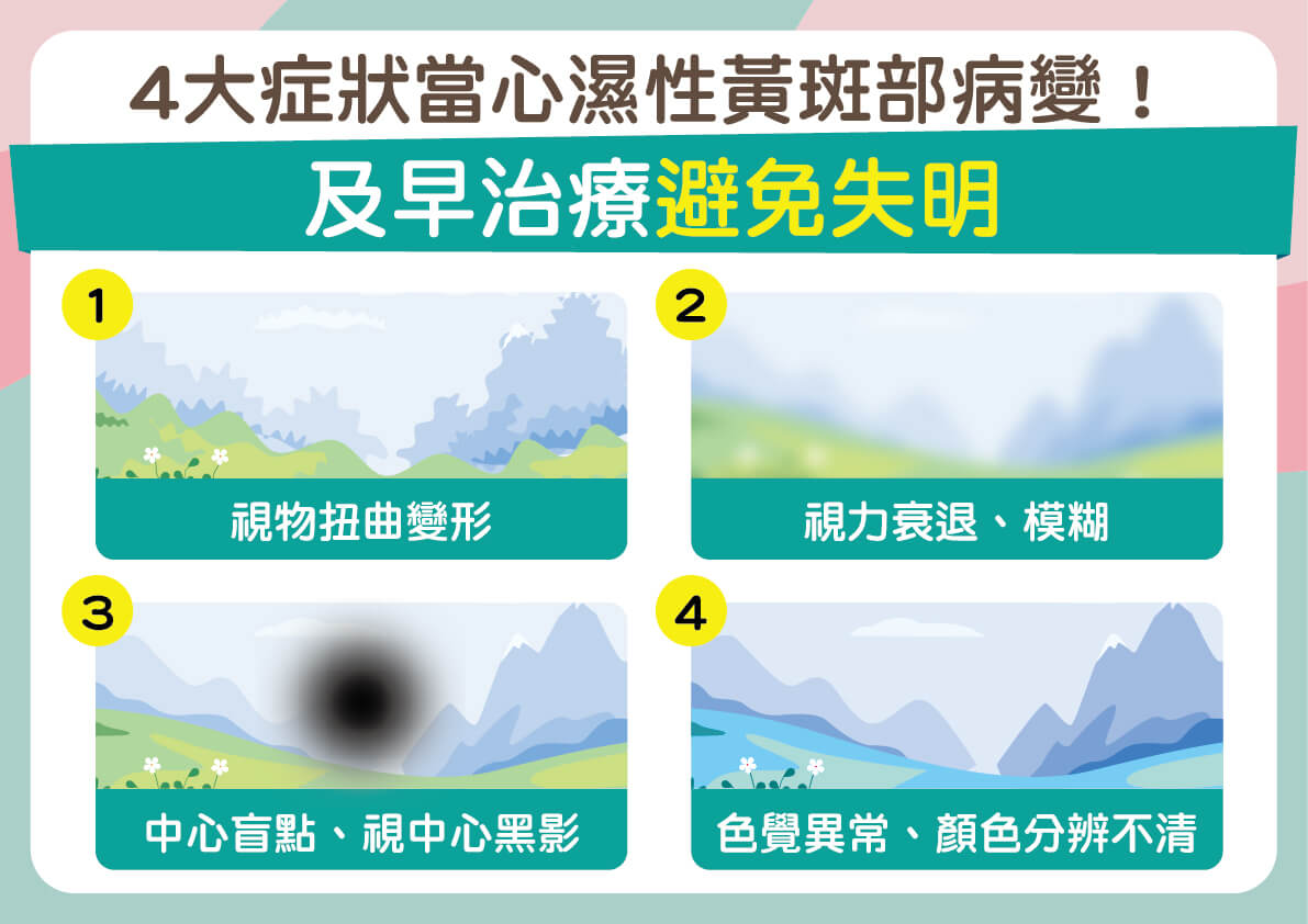 黃柔蓁醫師說明,老年性黃斑部病變可分為乾性及濕性。乾性是指在黃斑部下的結節及其後產生的萎縮性病變,形成原因主要是因年齡增長,造成視網膜代謝異常及營養不良。與濕性相比病情惡化速度較為緩和,這類病患約佔所有老年性黃斑部病變的90%。而濕性則是位於黃斑部下方之脈絡膜血管異常增生所引起之新生血管,由於新生血管容易因破裂導致出血或造成血液中的成分滲出,造成黃斑部腫脹,將大幅影響視力,約佔所有老年性黃斑部病變的10%。尤其出現視物扭曲變形,視力衰退、模糊,甚至色覺開始出現異常,務必立即就醫,避免視力迅速衰退。