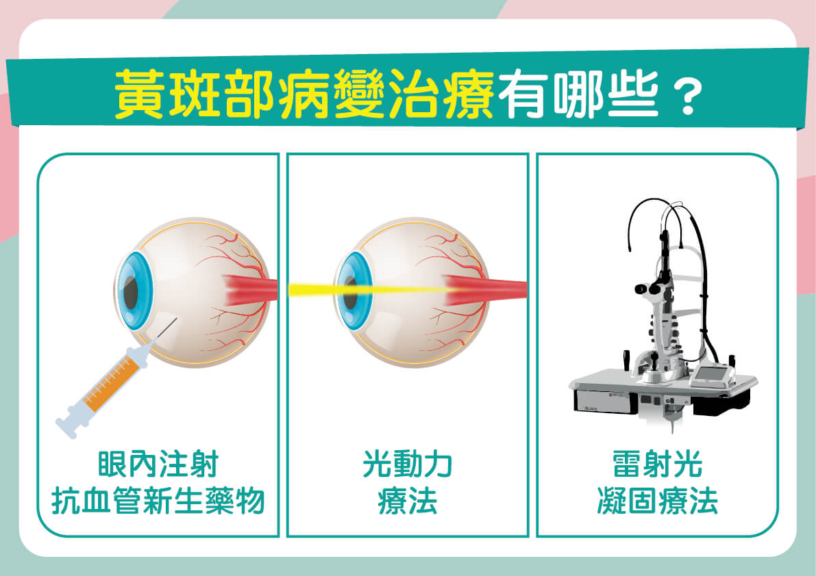 過去黃斑部病變的治療方式有雷射光凝固療法、經瞳孔光熱療法、光動力療法,雖然可以抑制血管新生,但是比較容易傷及正常的視覺細胞;目前主要的治療方式是眼內注射抗血管新生藥物,能鎖定不正常增生的血管,使其萎縮來達到改善視力的目標。但是不管使用何種治療,重點還是要及早且持續治療,愈早治療,視力恢復的機率就越大。此外,黃柔蓁醫師提醒,治療後不要忘記定期回診追蹤,積極控制原有疾病(三高)、戒除抽菸習慣,才是正確關鍵。