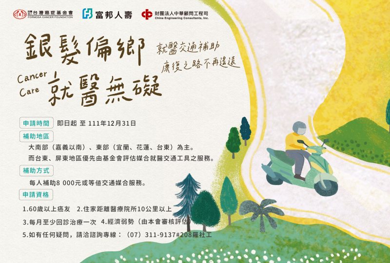 對偏鄉癌症病友來說,交通是一個隱形的必要需求,相較於疾病與治療,患者就醫過程的交通困境常不為人關注,但卻是影響穩定就醫的重要因素。台灣癌症基金會與富邦人壽攜手推出「銀髮偏鄉 就醫無礙」癌症治療交通補助專案,針對居住於大南部、宜花東等偏鄉地區60歲以上的癌友,只要住家距離醫療院所10公里以上,且每月至少回診治療一次,每名癌友可申請8,000元的交通補助,幫助他們穩定療程以利邁向康復之路。