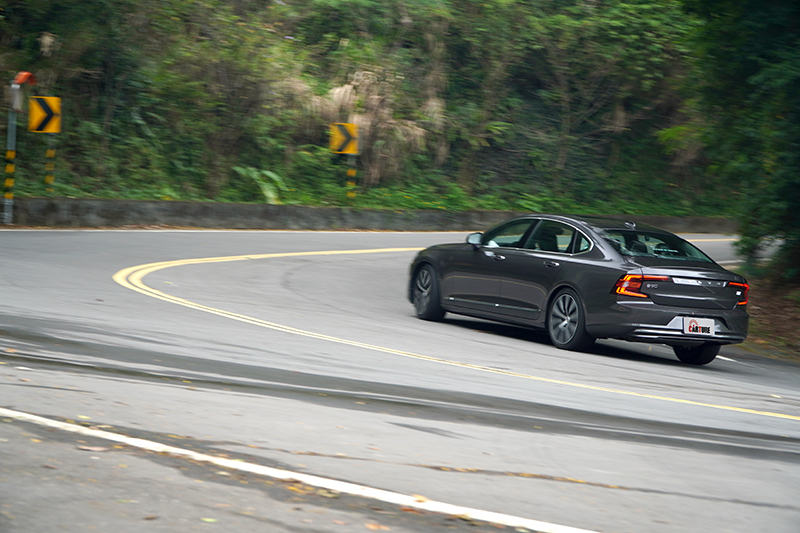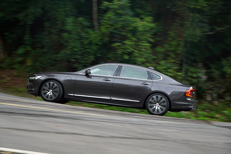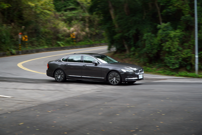 動力大增後的好處,就是就算它基本車重達2113kg,但開起來仍相當輕盈,其實依照當今的造車工藝,要讓這樣的大車可以輕鬆跑、輕鬆開並不難,即便不特別強調操控的Volvo,在尺碼最大的S90 T8 Recharge Inscription上,操控都在水準之上;在試駕當天,同事另借了一款歐系純鋼砲試駕,我們在山道交互支援拍照與駕駛後,我竟然比較喜歡S90 T8 Recharge Inscription開起來的感覺,鋼砲固然過彎犀利,衝勁十足,但動力更大的S90 T8 Recharge Inscription在加速上卻更為強勁,原廠0-100km/h加速成績為5.1秒,不僅數據勝過同行鋼砲,再加上尺碼的份量,全力衝刺時的移動能量更是明顯,特別的是,S90 T8 Recharge Inscription是輛大型房車,必須兼顧舒適性,懸吊設定必然不會像性能車那麼硬派,但也支撐性十足,不會讓車軟飄飄的難以控制,適切的轉向設定,反而可以讓人開得又快又輕鬆,不會像開鋼砲那樣得繃緊神經,除了遇到特別狹小的路段,S90 T8 Recharge Inscription卯起來跑還真不會輸鋼砲太多,有時還真會讓人忘了這是台車長超過五米、軸距超過三米,重量更超過兩噸的大車。也許是年紀大了,這種動力充沛的大車,開起來就是有種特別的舒爽感,這也代表,哪天後座的老闆想自己享受駕駛樂趣,在S90 T8 Recharge Inscription上也是能辦到,而性能鋼砲那種硬身段,偶爾小跑一下還行,天天代步、轟轟叫的日子還真是離我越來越遠。