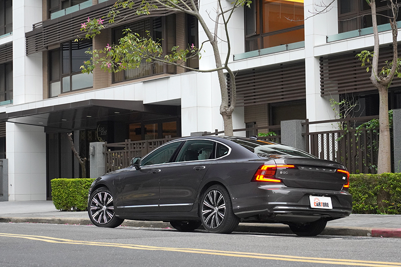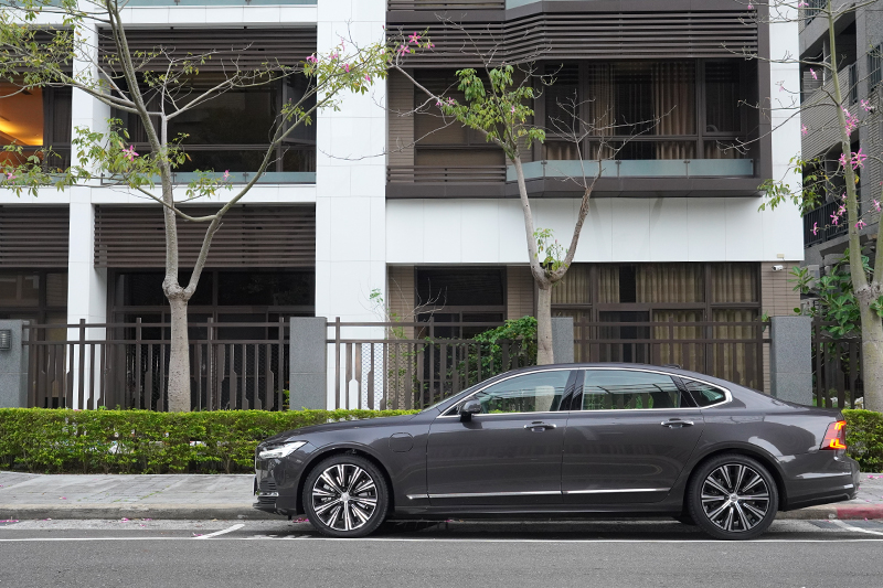 台灣引進的小改款S90長軸版車型,相較於標準版,軸距增加了120mm,至3061mm,車長也增長127mm,達5090mm,使得小改款S90在台灣成為同級車中,唯一軸距超過三米與車長車過五米的車款,這不僅讓它顯得霸氣,也頗為符合台灣不少消費者購車喜歡挑同價位中、尺碼較大車款的喜好;而本次試的S90 T8 Recharge Inscription與先前試的S90 B4 Inscription,在外觀上差異並不大,較容易辨認的地方就是S90 T8 Recharge Inscription在前葉子鈑上多了充電孔,另外就是車尾多了專屬的銘牌,以示身分。