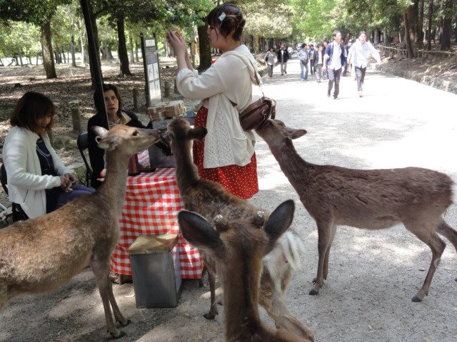 奈良公園附近會有一些賣鹿仙貝的小販,鹿大爺們都知道遊客會去買來餵牠們,因此就乾脆聚集在小販附近等候。