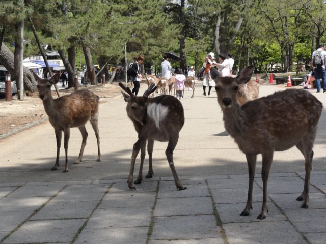 奈良的鹿完全不怕人,因為鹿在當地是代表神明的使者,大家愛護都來不及也不會有人去傷害牠們;可能是因為這樣,那些鹿大爺們一隻比一隻還大牌!