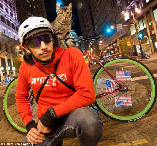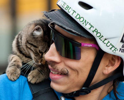 在美國費城有位Rudi Saldia,是當地人氣最旺的單車快遞員,也是收件者最期望前來送件的快遞員呢!喔,正確來說,人氣最旺、最想見到的快遞員其實是,《搭肩貓MJ》!