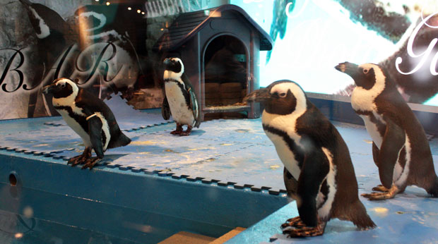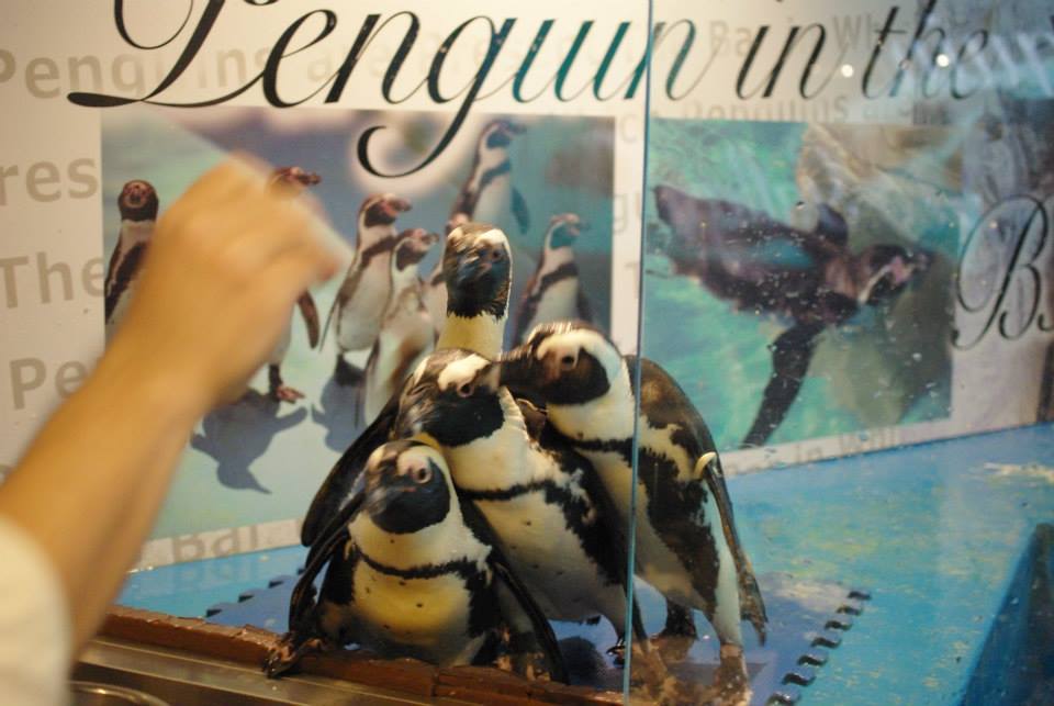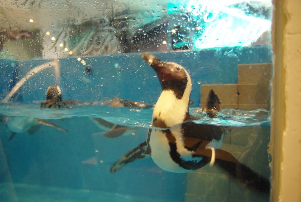 這間位於東京池袋的酒吧是去年的10月7日開幕的,號稱是東京唯一一間有企鵝的酒吧。(老闆客氣了,我相信全日本大概也找不到幾間有企鵝的酒吧!)店裡飼養了二對企鵝夫妻,平時就在特製的水池區活動;有時在岸邊走來走去,有時則是在水池中盡情游泳,讓來店裡消費的客人可以近距離地看到企鵝可愛的一舉一動!