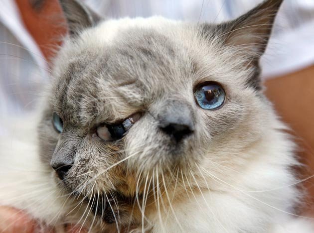 2009年金氏世界紀錄上活到最老的雙面貓是Frank和Louie,牠們有3隻眼睛、2個鼻子,和主人Marty一起生活在美國麻州,目前已經13歲囉。根據調查,雙面貓的案例還真不少,像是2006年佛羅里達的因佛內斯,有一隻小貓咪因為早產2星期,所以兩個嘴巴連到同一個食道,成了雙面貓;2007年在亞利桑那州出生的Lil'Bit,2008年澳洲珀斯的動物診所曾接生過的雙面喵,2010年在西維吉尼亞出生的小喵,以及2012年在佛羅里達出生的小黑貓,都是當時廣為報導的雙面喵喵呢。(圖片來源: http://www.niusnews.com/=0615aw5)