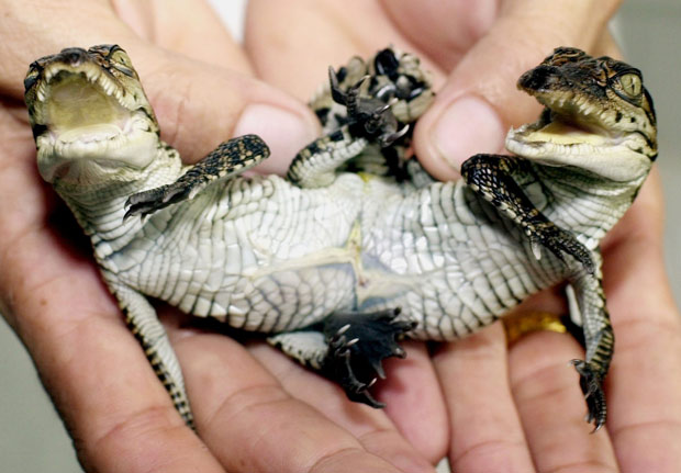 位在國曼谷的Samut Prakarn鱷魚農場,有隻肚子連在一起的迷你連體鱷魚,只有蜥蜴般的大小,兩隻都長17公分,只重70克。(圖片來源: headed -thesun)
