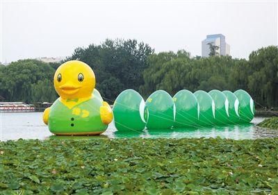 穿上綠西裝的崩壞鴨,位在北京玉淵譚公園,後面還帶了鴨蛋裝可愛