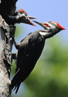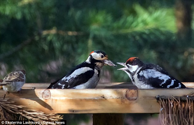 啄木鳥媽不時地催促啄木鳥爸找食物,牠留守照顧這群可憐的孩子,盡忠職守的鳥爸不停去找食物,但也沒忘得提醒鳥媽,自家孩子還沒吃飽。