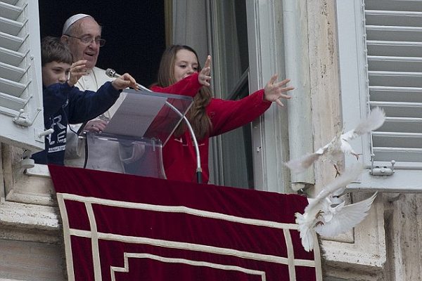 梵蒂岡教皇Francis站在兩個孩子中間,當時他們在聖彼得廣場(St Peter’s Square)準備釋放一對純潔的白鴿,沒想到這對白鴿自教皇Francis的工作室窗口離開後,不但沒有飛向自由的藍天,反而被在一旁虎視眈眈的海鷗與烏鴉盯上,慘遭一連串無情的攻擊。
